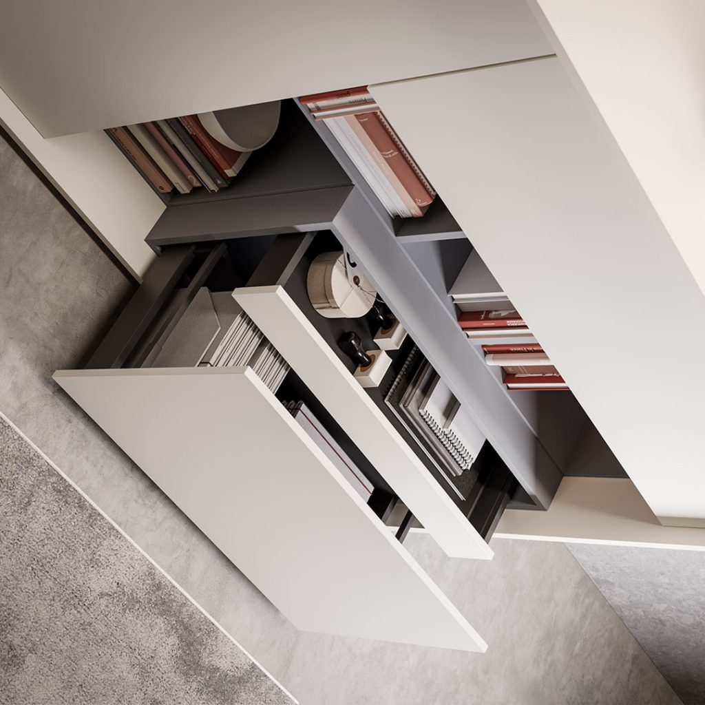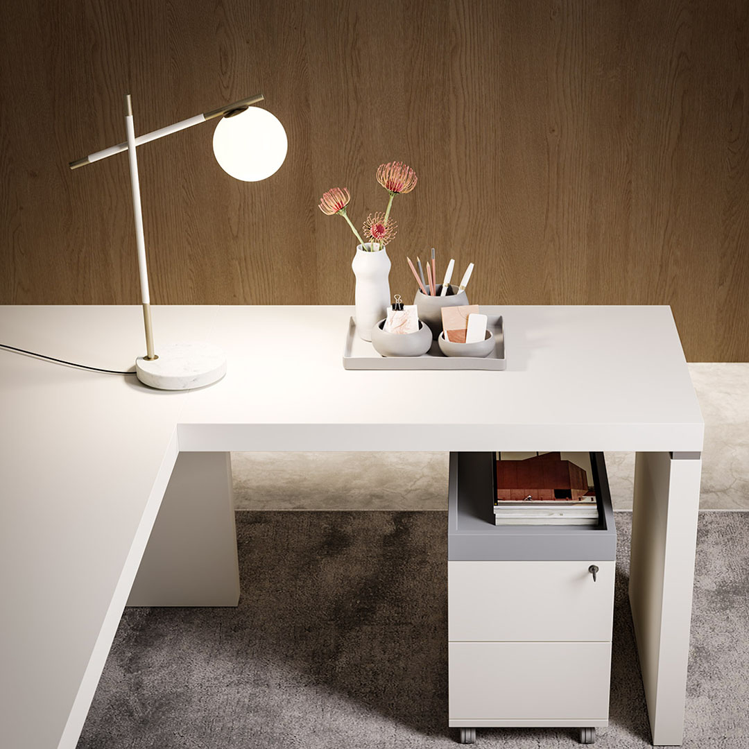 Nella versione EXECUTIVE / EXECUTIVE PLUS la scrivania è con piano e gamba sp 60 mm, gonna sp 18/19 mm e cassettiera portante. La versione Executive plus si distingue per il piano a tutta lunghezza.