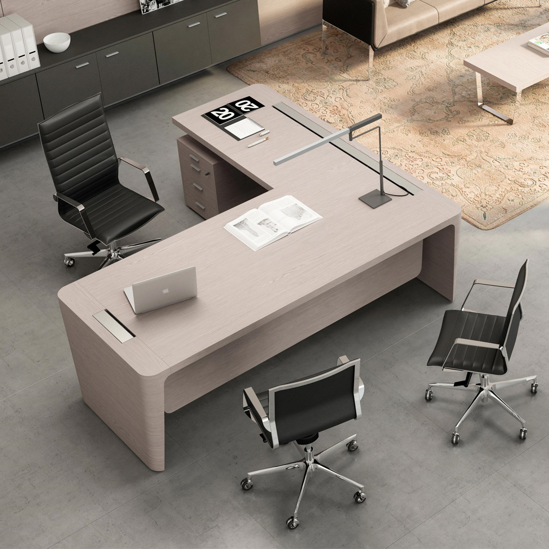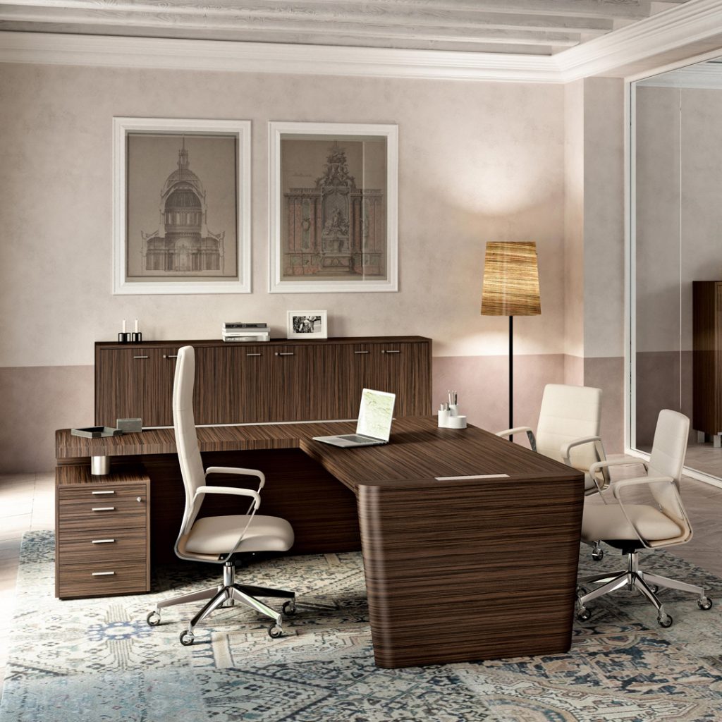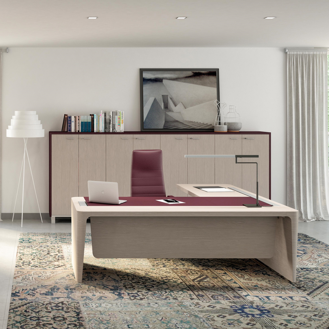 Le scrivanie privilegiano l’eleganza delle forme e la ricchezza nella composizione dei volumi, trasformandosi immediatamente in simbolo della modernità. Elementi rigorosi, contrasti visuali, linee inclinate e giochi compositivi delimitano le superfici della scrivania direzionale. Matericità e tonalità eleganti per il gusto del manager contemporaneo.