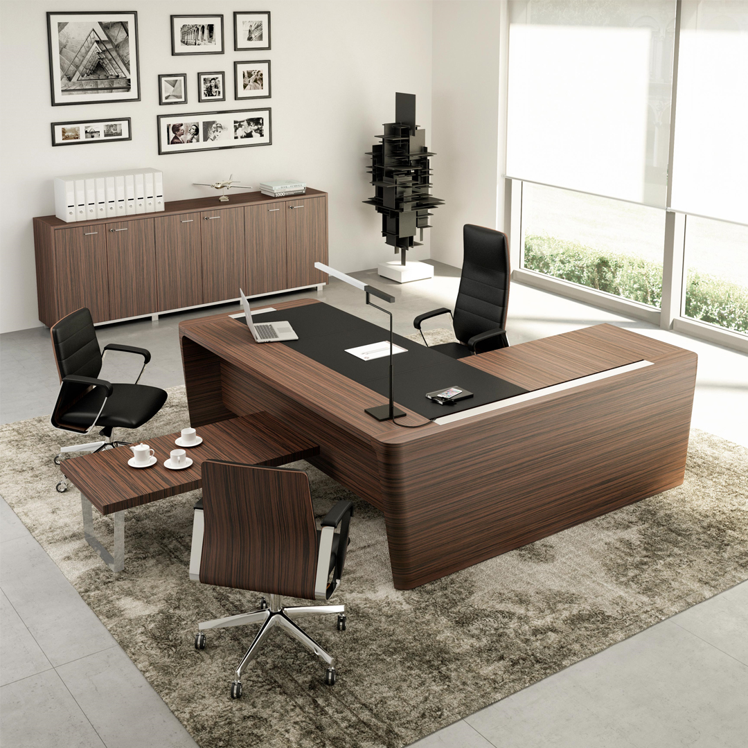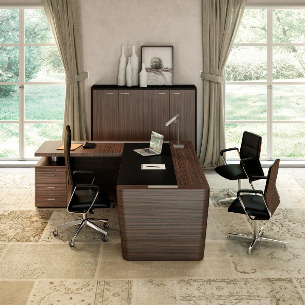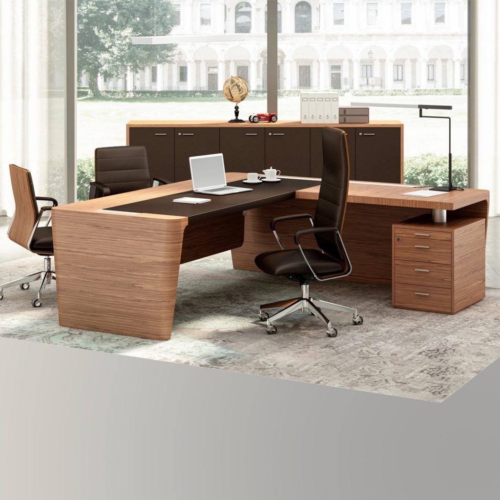 Le scrivanie privilegiano l’eleganza delle forme e la ricchezza nella composizione dei volumi, trasformandosi immediatamente in simbolo della modernità. Elementi rigorosi, contrasti visuali, linee inclinate e giochi compositivi delimitano le superfici della scrivania direzionale. Matericità e tonalità eleganti per il gusto del manager contemporaneo.