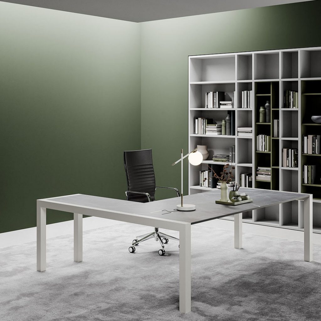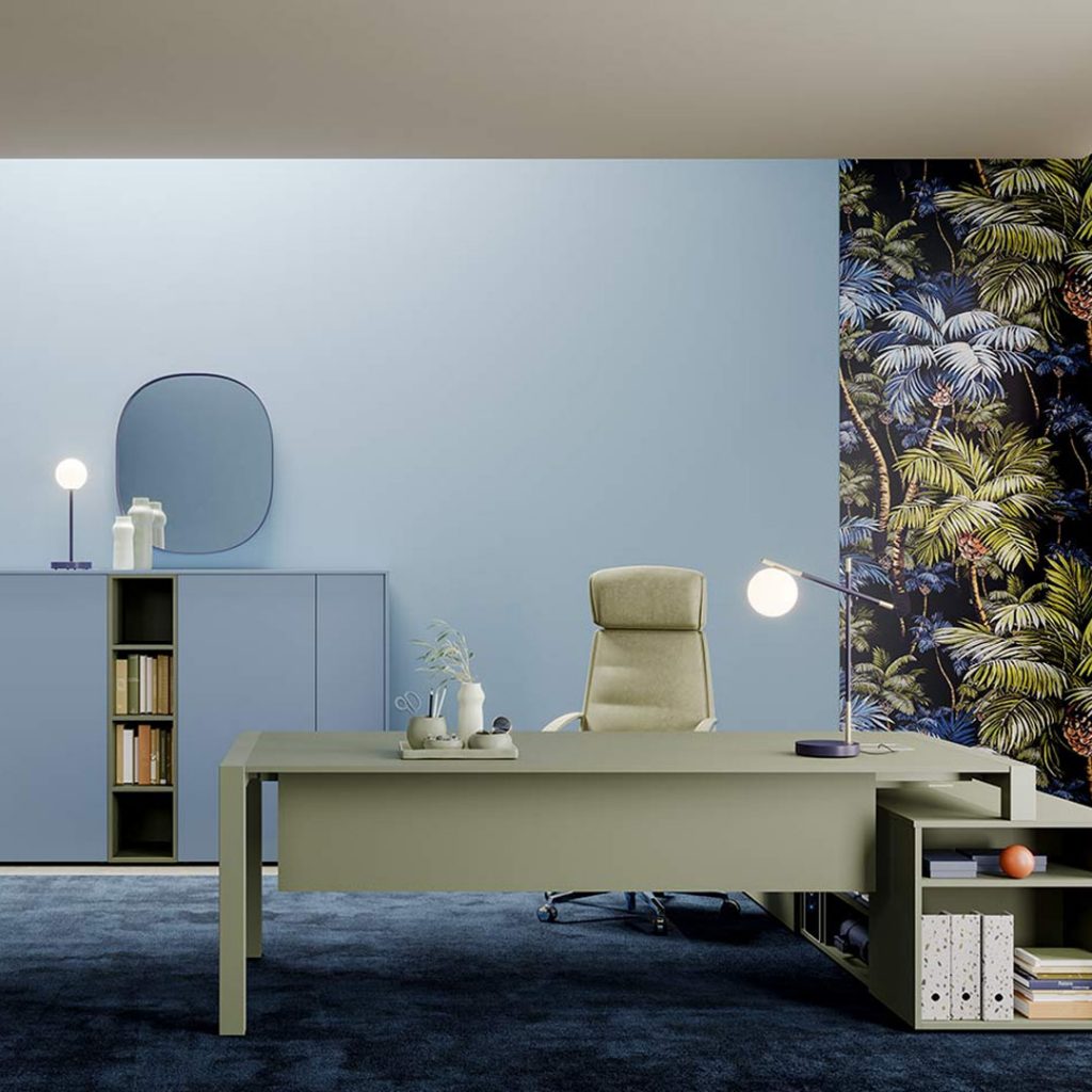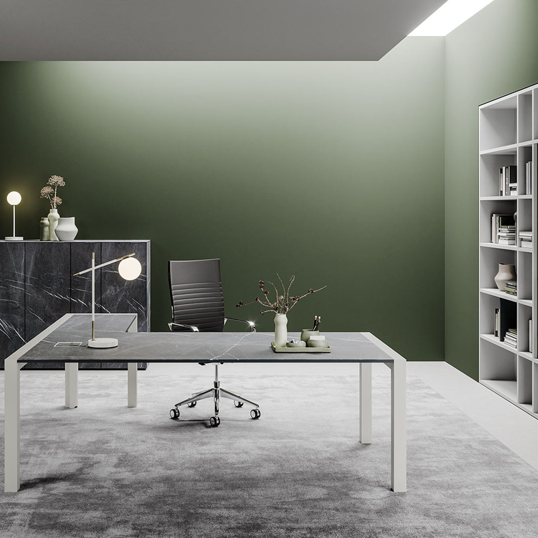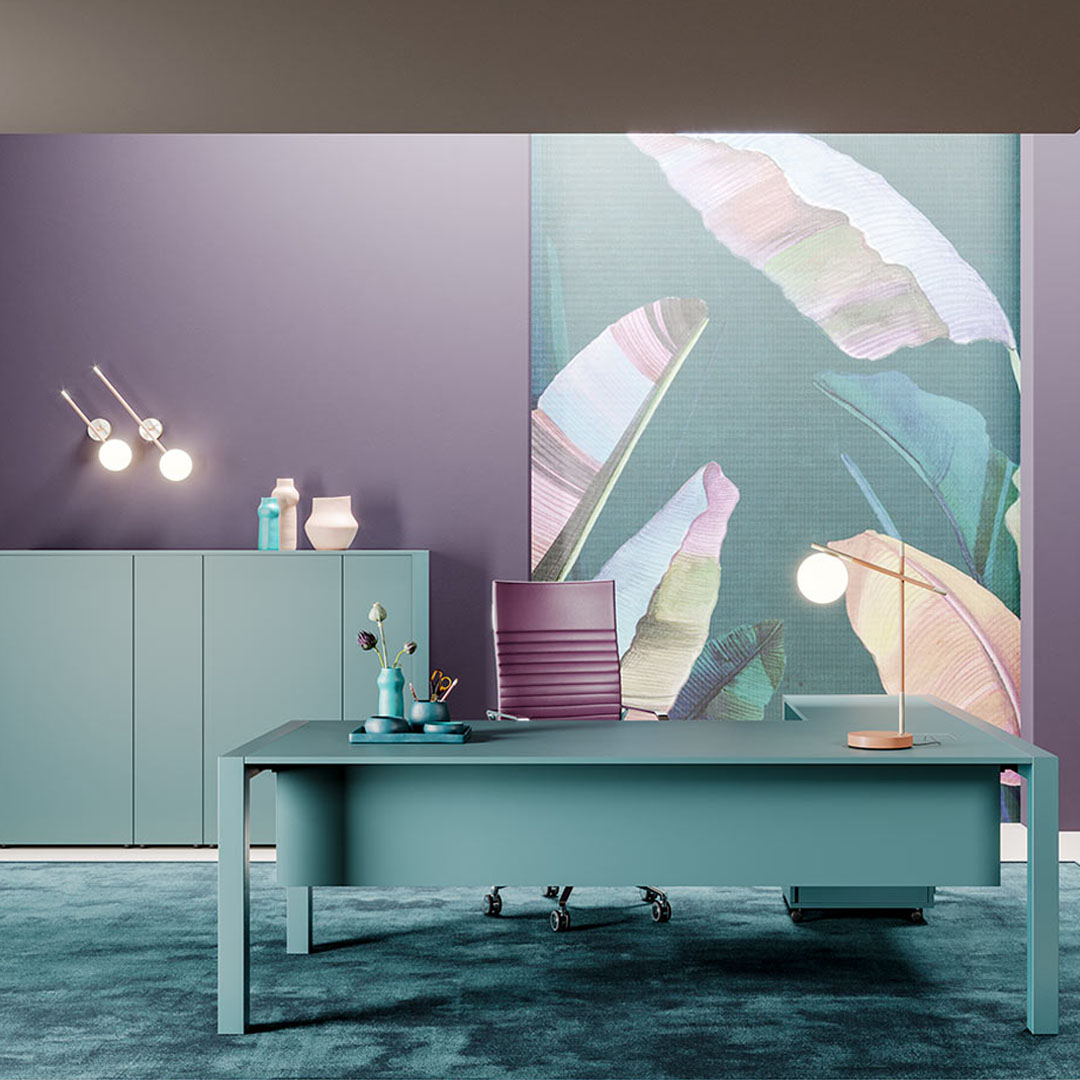 Ricca è la proposta di materiali e finiture, con tonalità coordinate su tutte le superfici. È infatti possibile scegliere una tinta unica per piano e struttura o un mix di colori in perfetto accostamento cromatico. Il piano può essere in legno melaminico, laccato, vetro laccato anti touch, brillante ed effetto marmo, Fenix e legno impiallacciato. La struttura è verniciata opaca in tutta la gamma di colori a catalogo. La scrivania viene proposta con o senza gonna in versione semplice, con piano dattilo, su unità modulare e su unità scorrevole.