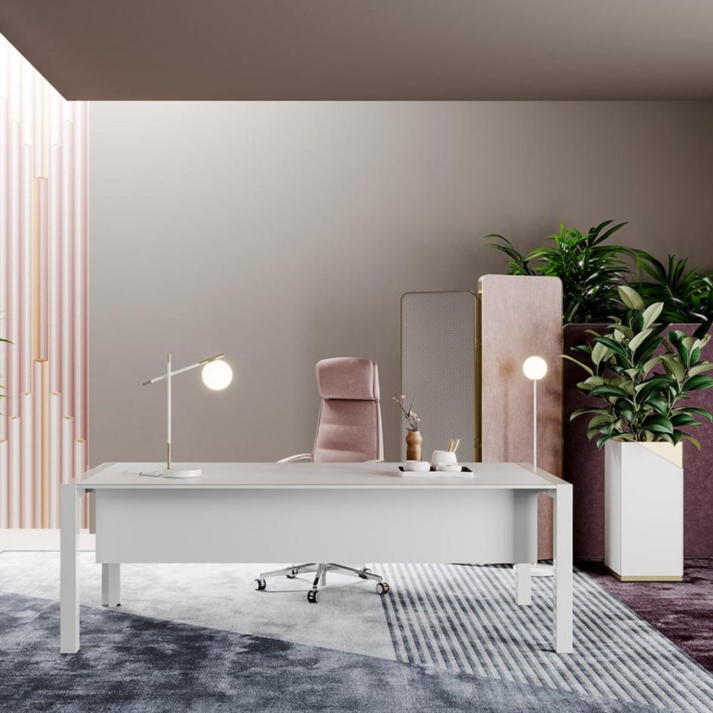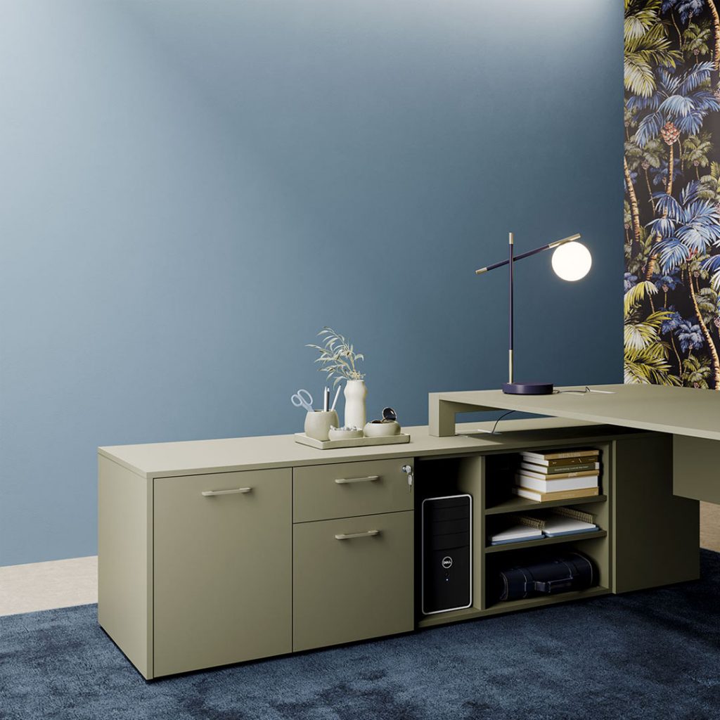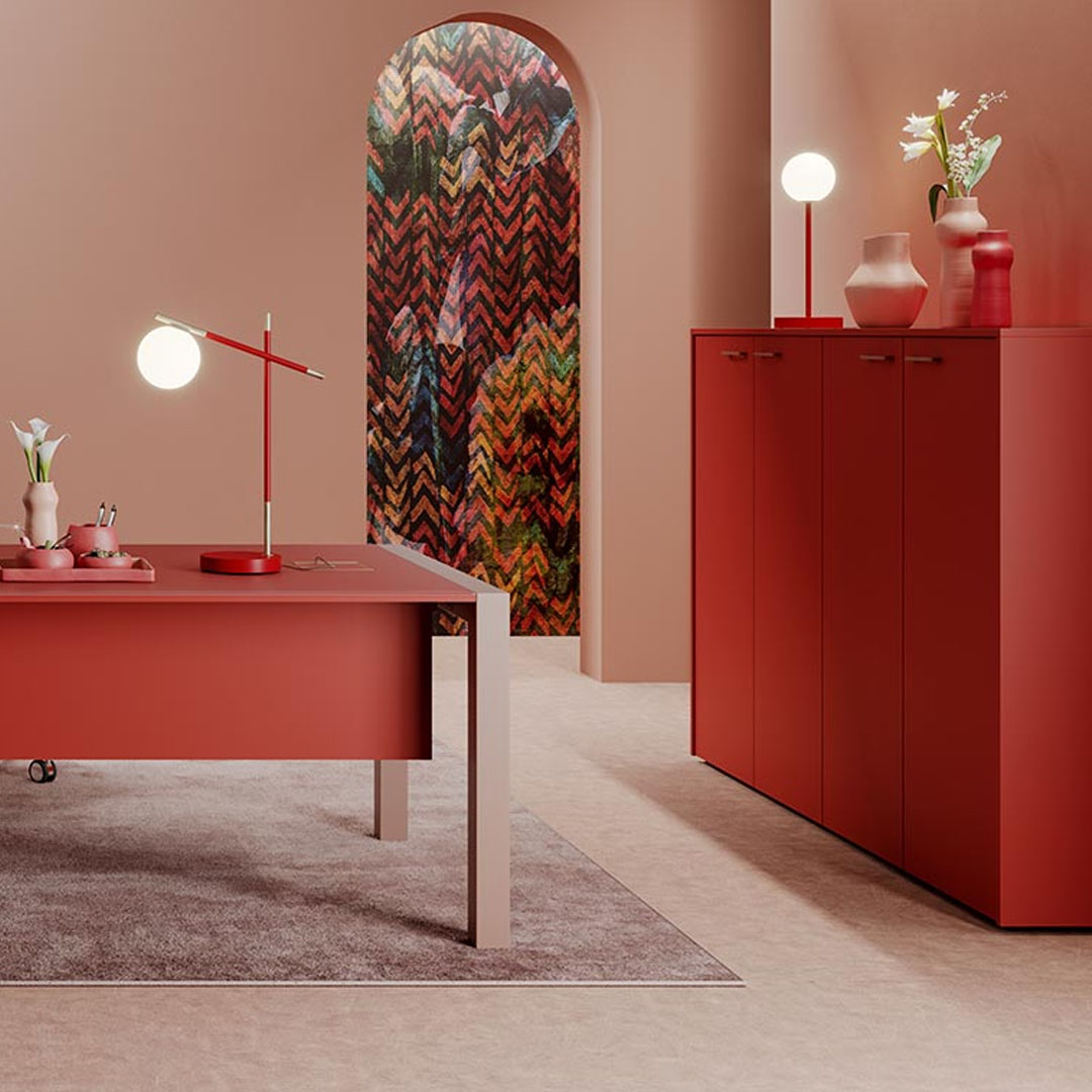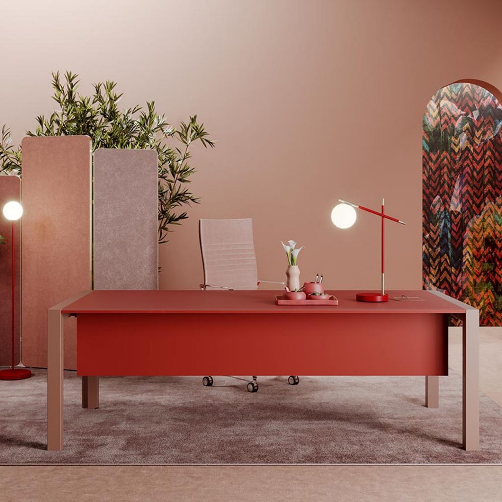 Ricca è la proposta di materiali e finiture, con tonalità coordinate su tutte le superfici. È infatti possibile scegliere una tinta unica per piano e struttura o un mix di colori in perfetto accostamento cromatico. Il piano può essere in legno melaminico, laccato, vetro laccato anti touch, brillante ed effetto marmo, Fenix e legno impiallacciato. La struttura è verniciata opaca in tutta la gamma di colori a catalogo. La scrivania viene proposta con o senza gonna in versione semplice, con piano dattilo, su unità modulare e su unità scorrevole.