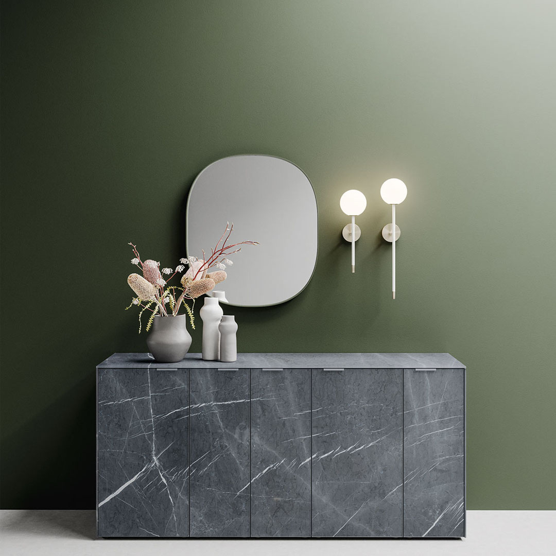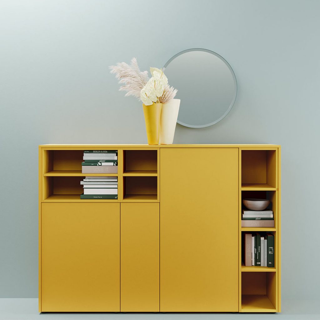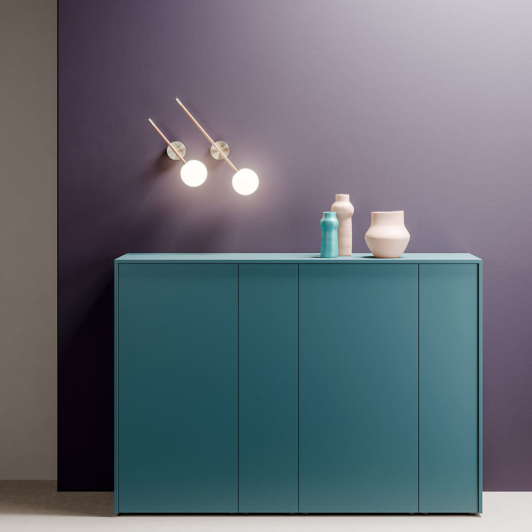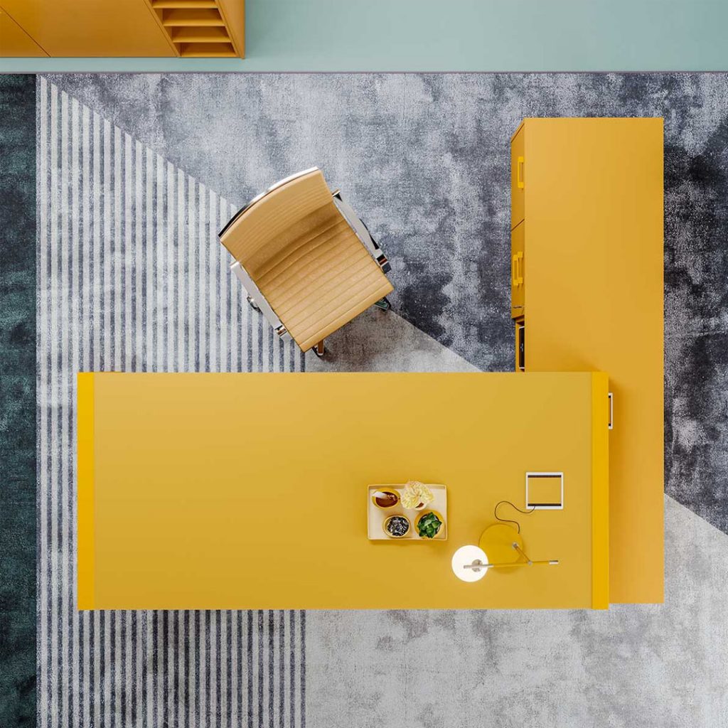 Ricca è la proposta di materiali e finiture, con tonalità coordinate su tutte le superfici. È infatti possibile scegliere una tinta unica per piano e struttura o un mix di colori in perfetto accostamento cromatico. Il piano può essere in legno melaminico, laccato, vetro laccato anti touch, brillante ed effetto marmo, Fenix e legno impiallacciato. La struttura è verniciata opaca in tutta la gamma di colori a catalogo. La scrivania viene proposta con o senza gonna in versione semplice, con piano dattilo, su unità modulare e su unità scorrevole.