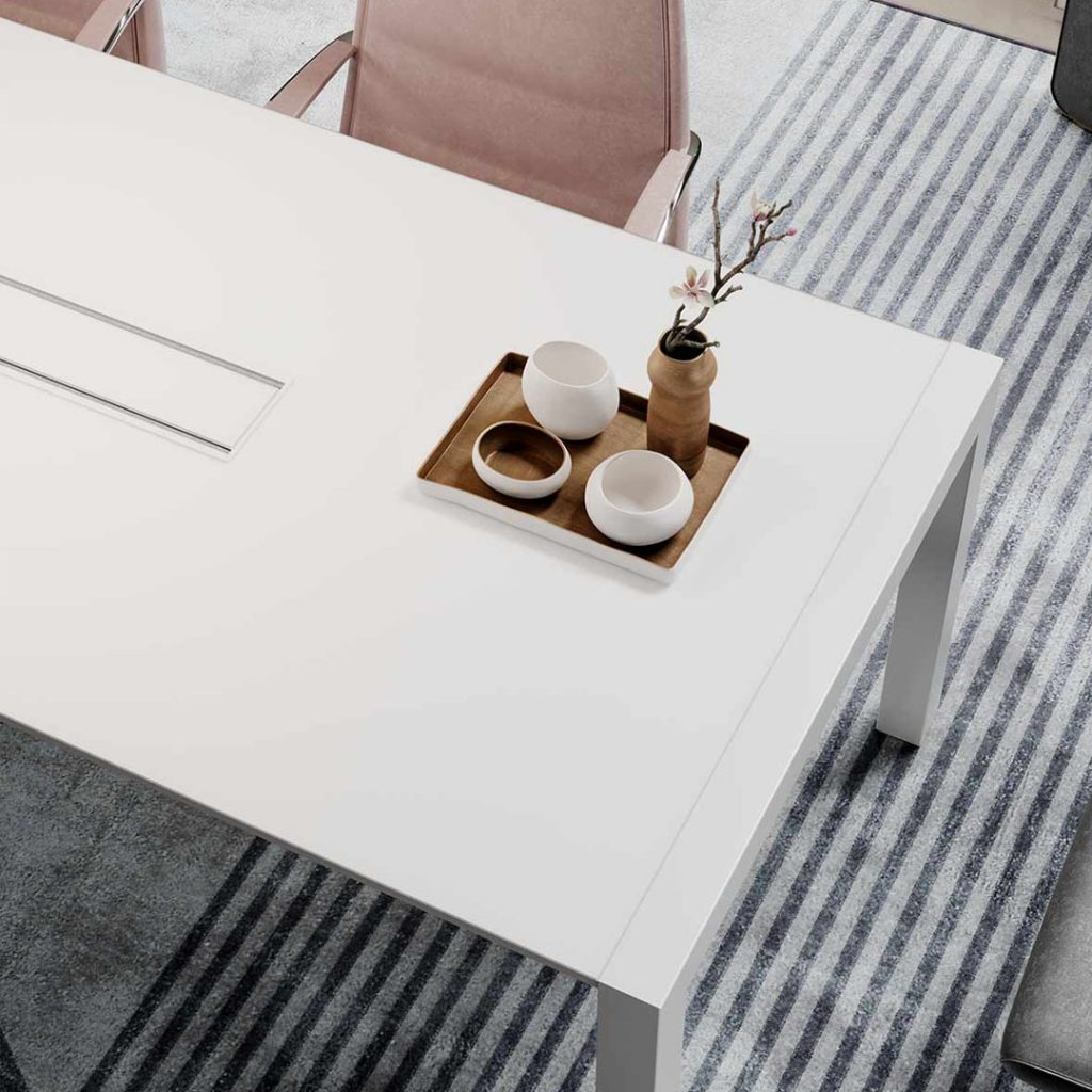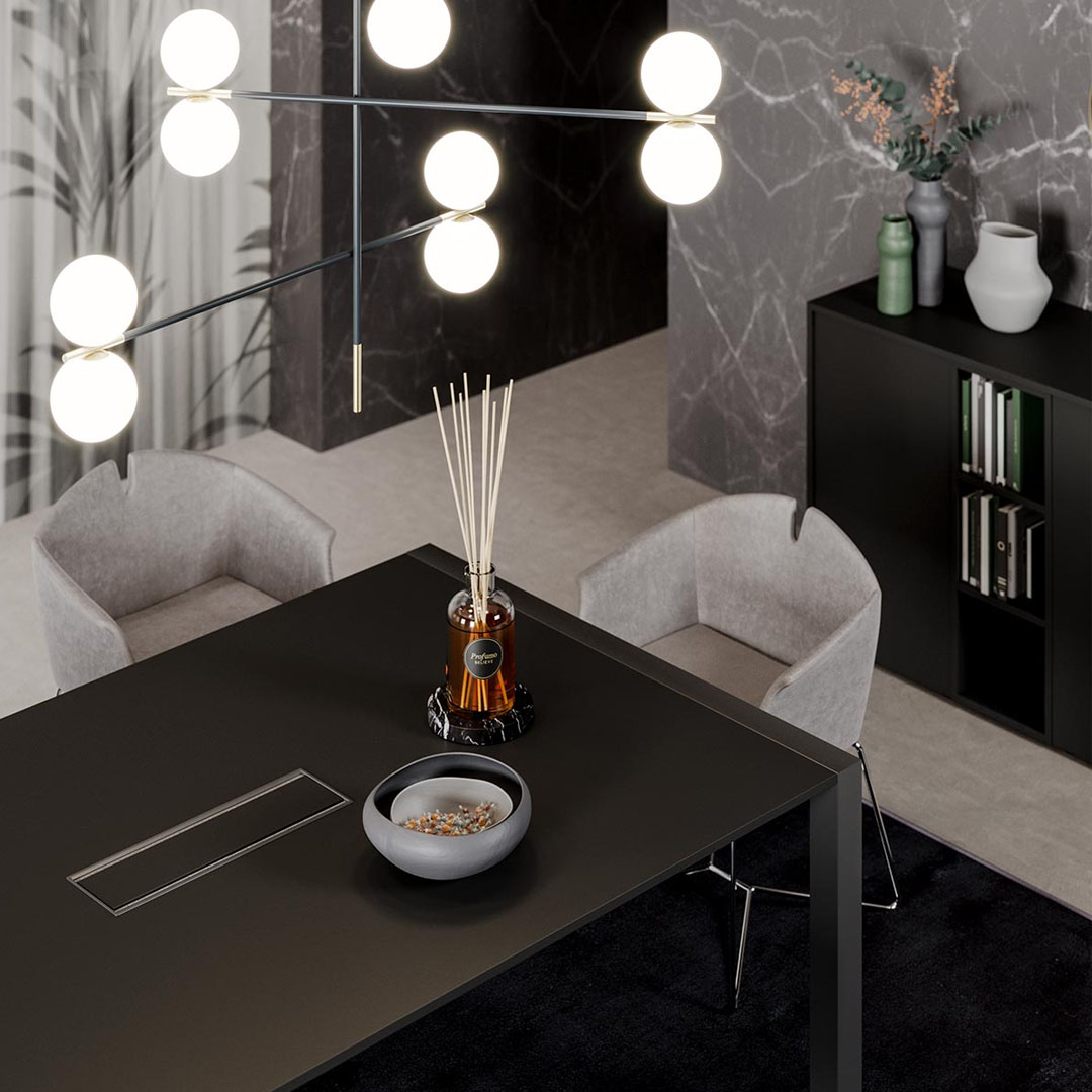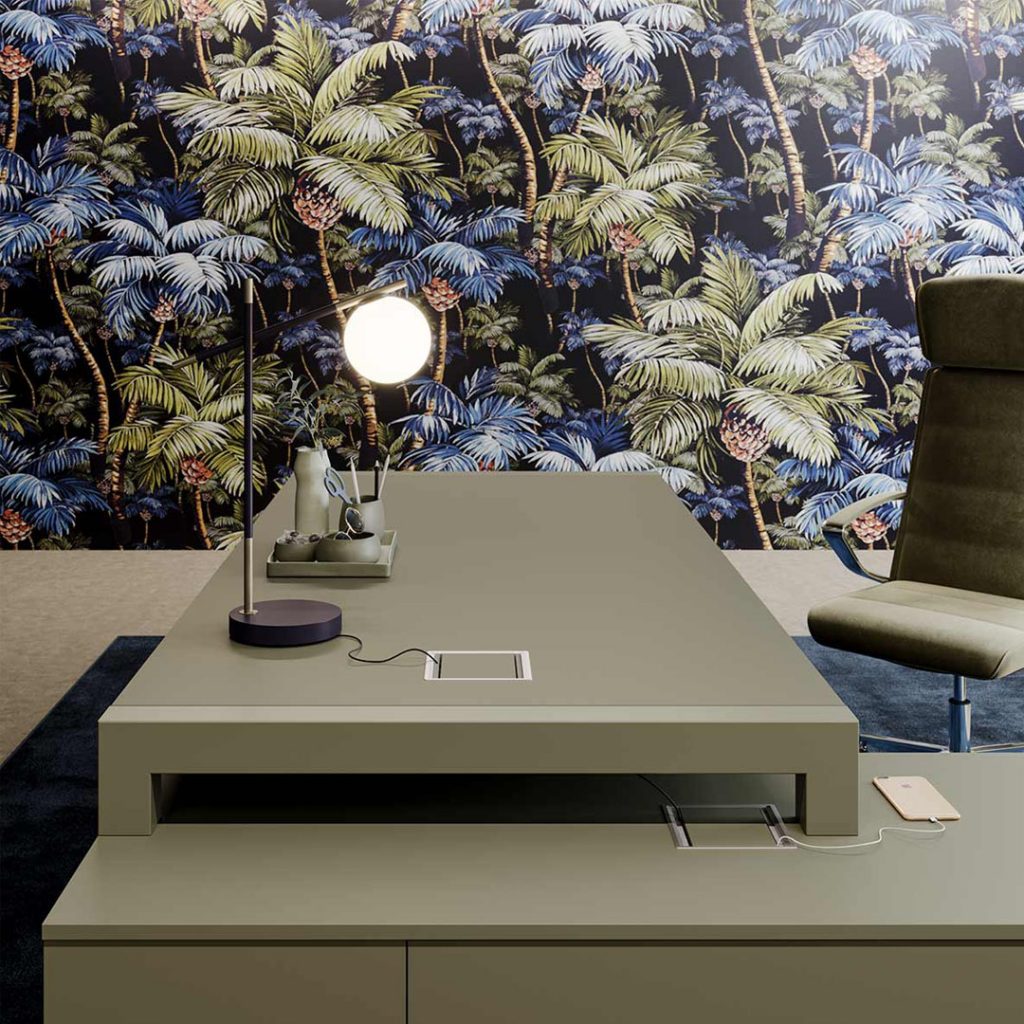 La scrivania può essere dotata di un piccolo carter in tinta fissato ad una gamba tramite dei magneti per agevolare e nascondere il passaggio verticale dei cavi e una vasca per la canalizzazione orizzontale. Il piano può avere un passacavo rettangolare o quadrato in finitura anodizzata alluminio, nero, ottone o verniciato bianco con sportello apribile in tinta con il piano. É prevista anche la possibilità di installare un caricatore wireless a scomparsa totale nel piano. Il mobile di servizio, su richiesta, può essere corredato con il medesimo passacavo.