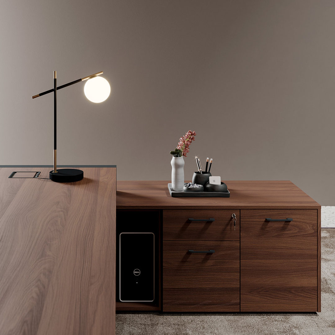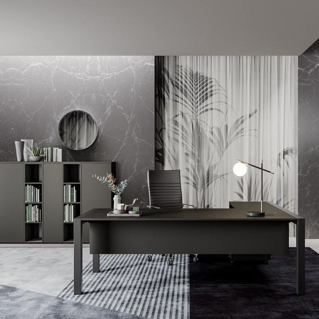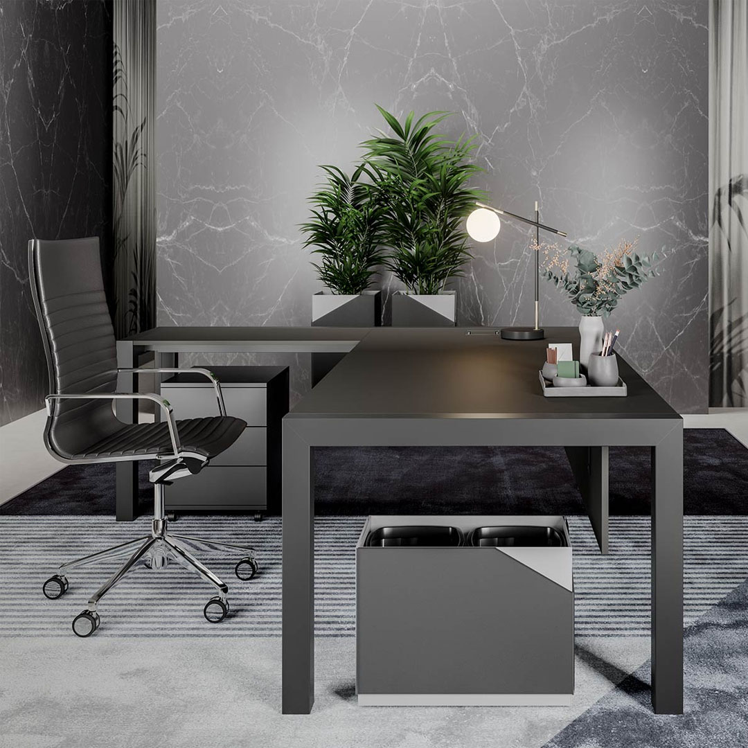 La scrivania ha una struttura composta da gambe a portale realizzate in tubolari di acciaio 70x70 mm nelle finiture metallo opaco. I piani possono essere in legno impiallacciato, Fenix NTM®, melaminico con pannelli spessore di 18/19 mm o in vetro spessore totale 18 mm con lastre di 4 mm su supporto melaminico bianco o nero sp. 14 mm con bordo in tinta con il piano. Su richiesta è disponibile la gonna di altezza 360 mm nelle stesse finiture del piano. L’ unità modulare è un mobile contenitore composto da elementi modulari liberamente accostabili tra loro in profondità 600 mm e in due larghezze 416 mm e 832 mm. Si può scegliere il modulo a giorno, porta cpu, chiuso con anta, a 1 cassetto e classificatore, a 3 cassetti, con maniglia o premi apri. È disponibile anche il modulo con vani a giorno di testa iniziale o finale.