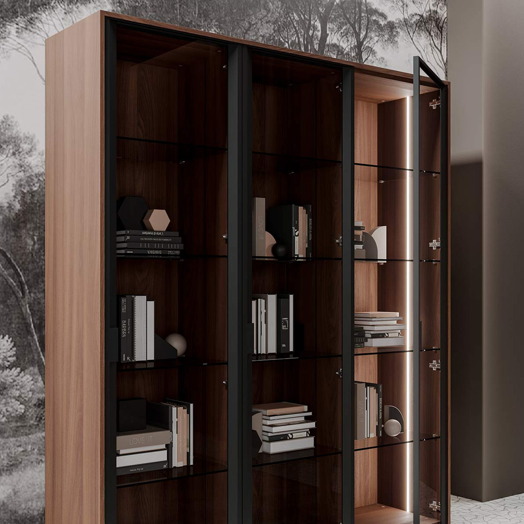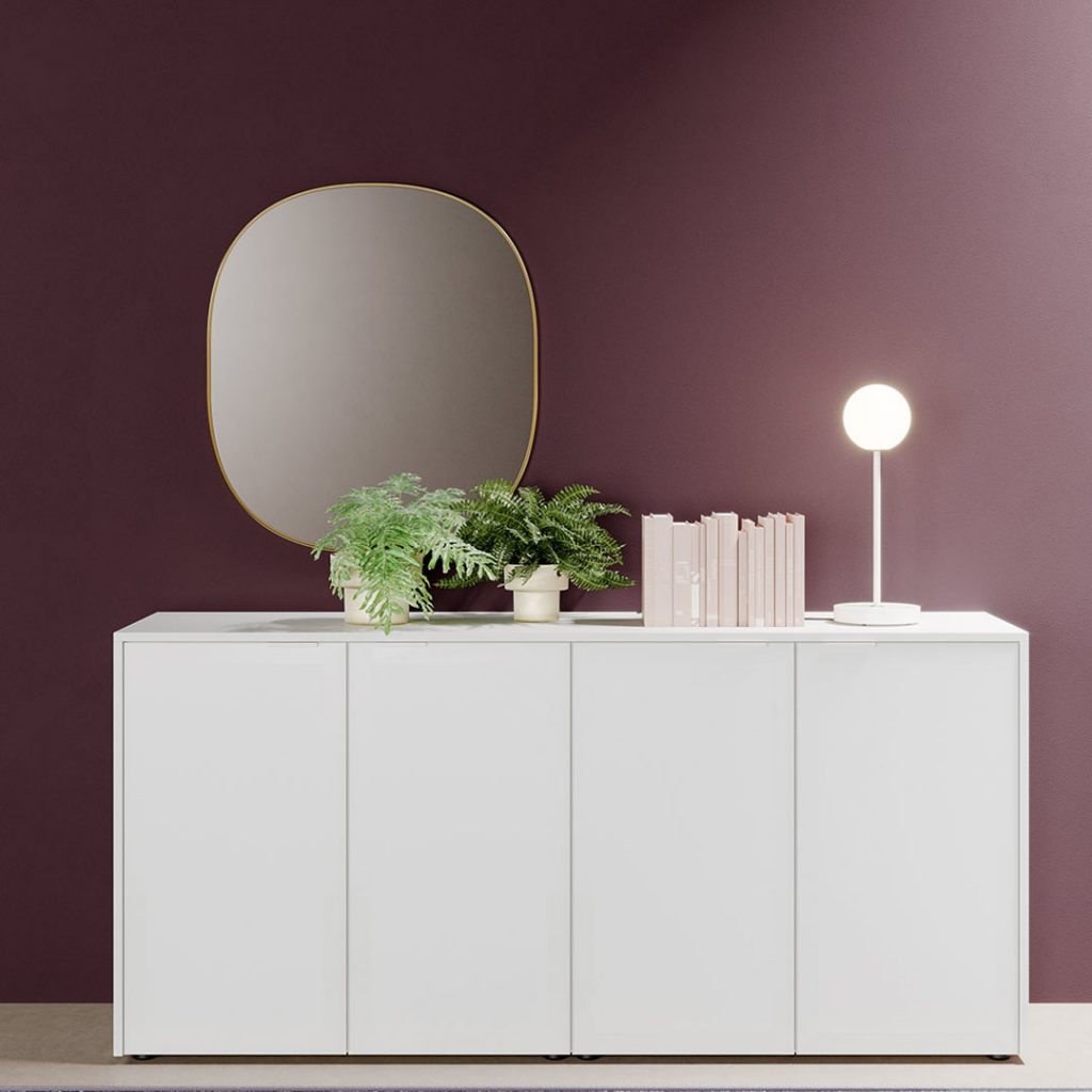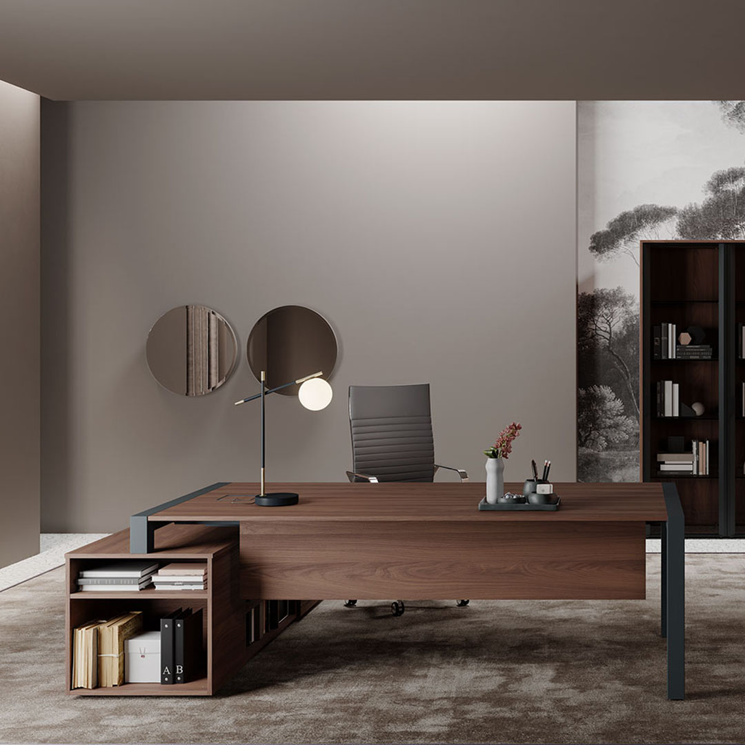 La scrivania ha una struttura composta da gambe a portale realizzate in tubolari di acciaio 70x70 mm nelle finiture metallo opaco. I piani possono essere in legno impiallacciato, Fenix NTM®, melaminico con pannelli spessore di 18/19 mm o in vetro spessore totale 18 mm con lastre di 4 mm su supporto melaminico bianco o nero sp. 14 mm con bordo in tinta con il piano. Su richiesta è disponibile la gonna di altezza 360 mm nelle stesse finiture del piano. L’ unità modulare è un mobile contenitore composto da elementi modulari liberamente accostabili tra loro in profondità 600 mm e in due larghezze 416 mm e 832 mm. Si può scegliere il modulo a giorno, porta cpu, chiuso con anta, a 1 cassetto e classificatore, a 3 cassetti, con maniglia o premi apri. È disponibile anche il modulo con vani a giorno di testa iniziale o finale.
