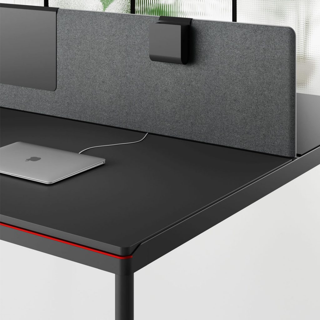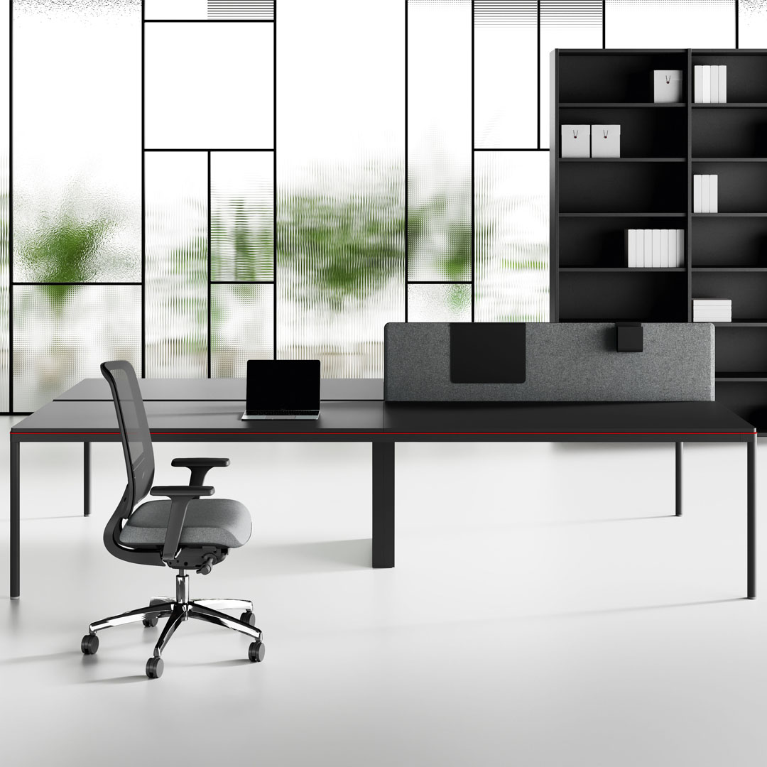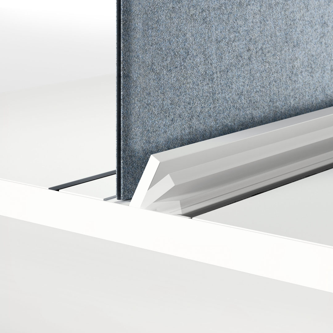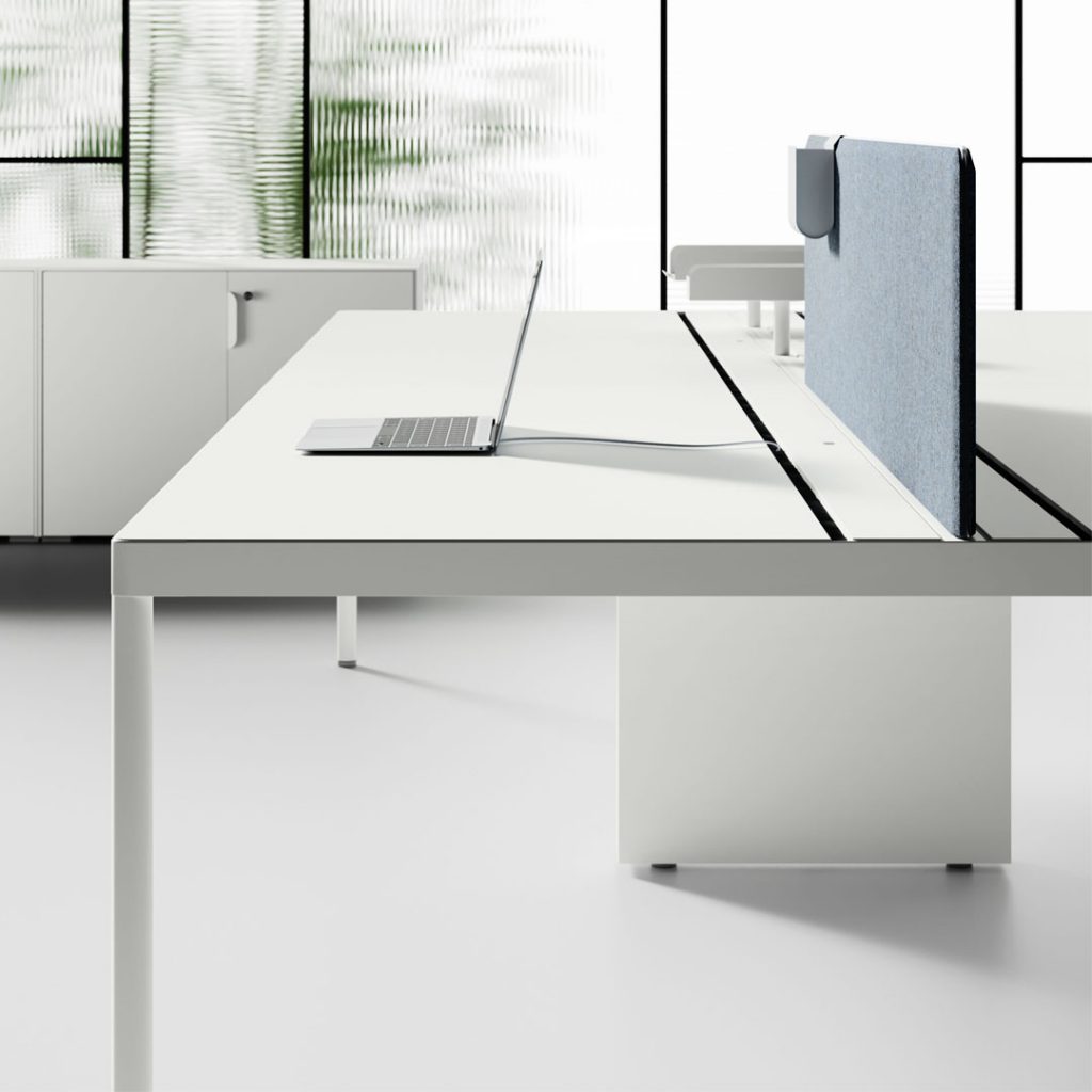Le postazioni sono attrezzate con barre centrali utili al fissaggio di tutte le tipologie di schermi acustici a catalogo e di porta oggetti, porta fogli, bracci per schermi o lampade da tavolo.