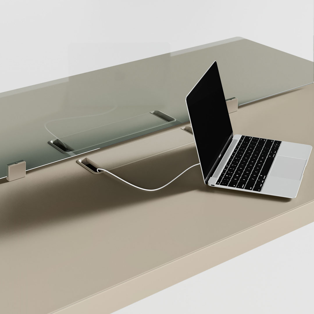 Postazioni perfettamente cablate, per il lavoro condiviso o la riunione operativa veloce, che separano e proteggono grazie a schermi trasparenti in vetro.