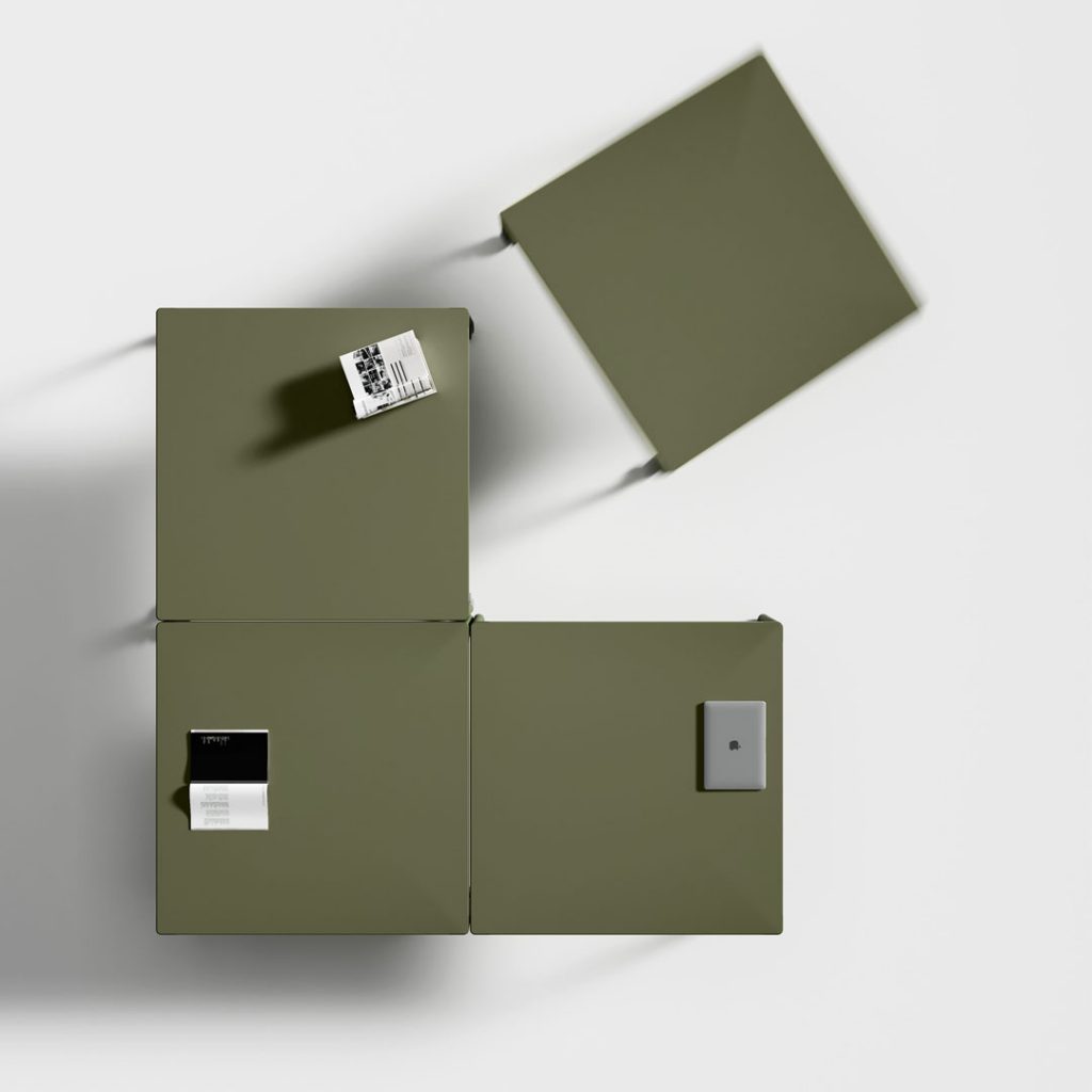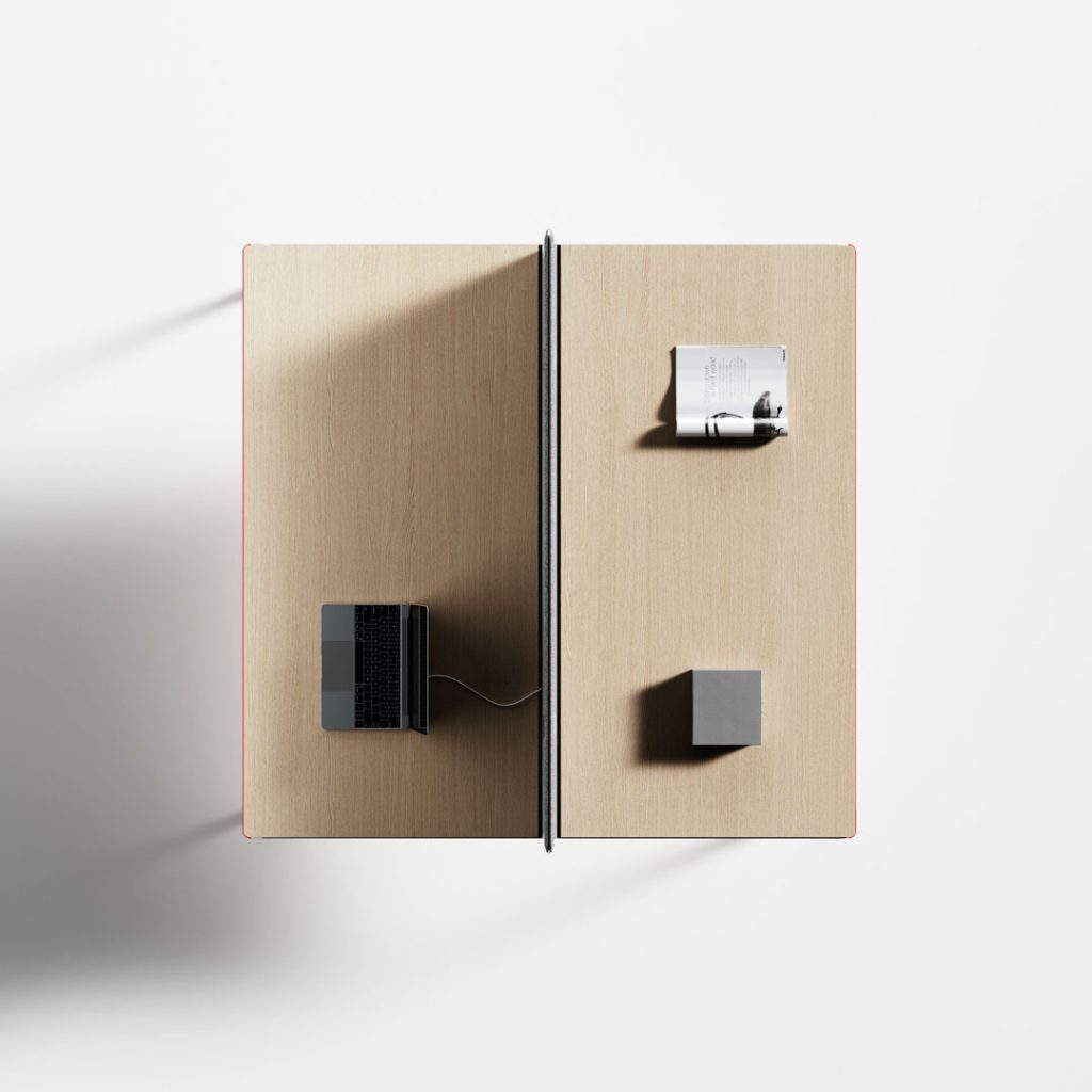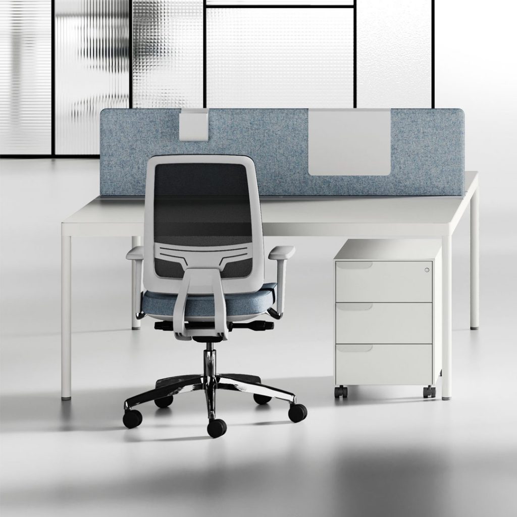 Lo schermo fonoassorbente, ove presente, separa e arreda. La funzione tecnica di presidio acustico cede il passo a quella estetica di accessorio di elevato design. Gli accessori metallici in quattro colori permettono il contenimento di cancelleria e piccoli oggetti di uso corrente.