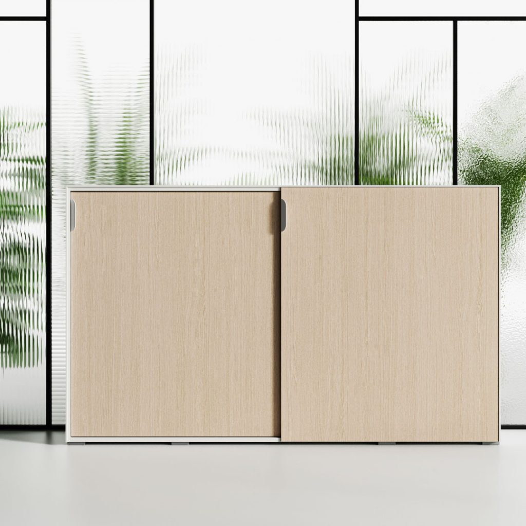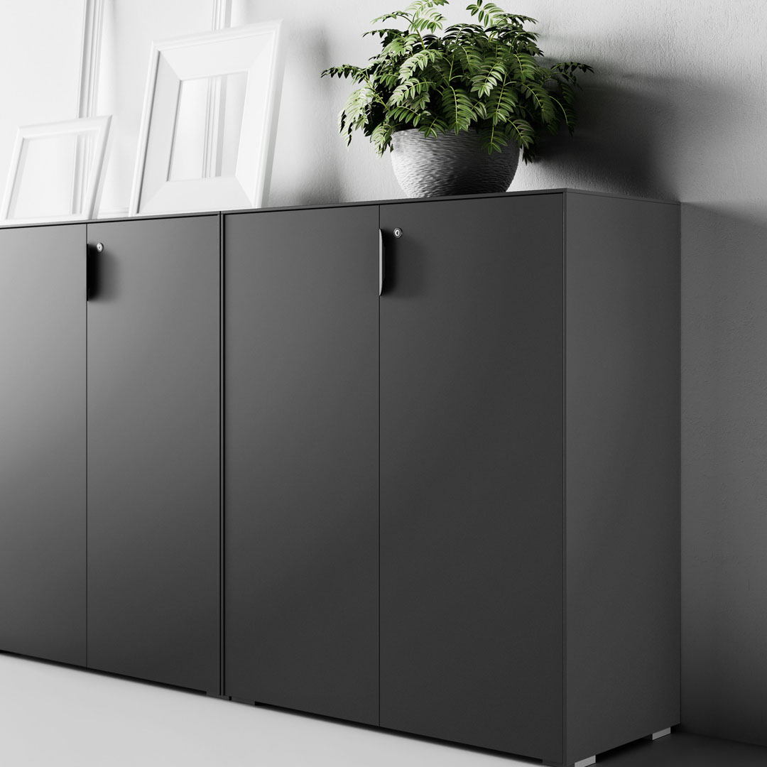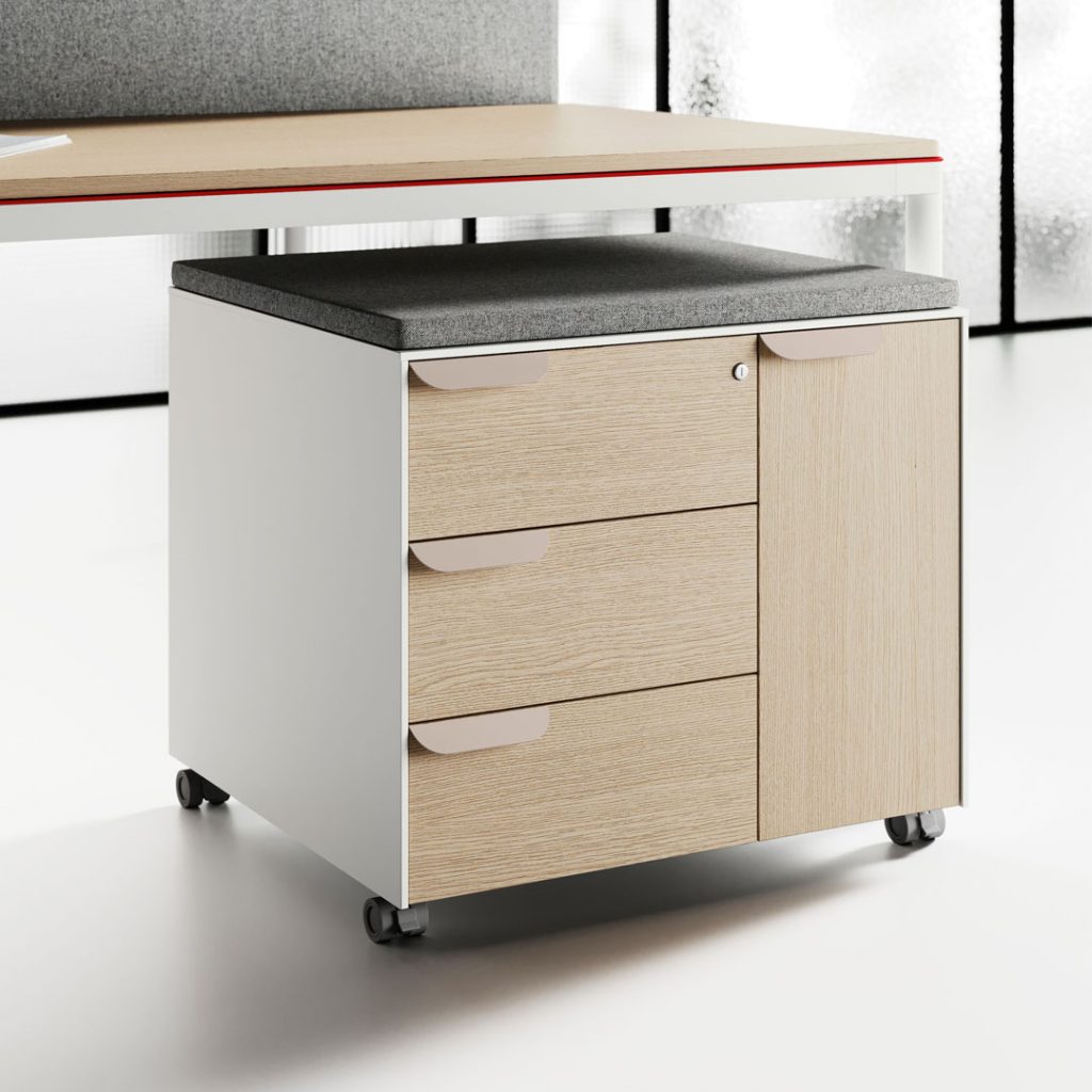 Il contenimento è affidato a volumi rigorosi e compatti che fanno da contraltare alle forme morbide delle scrivanie. Una dialettica formale che caratterizza tutta la collezione.