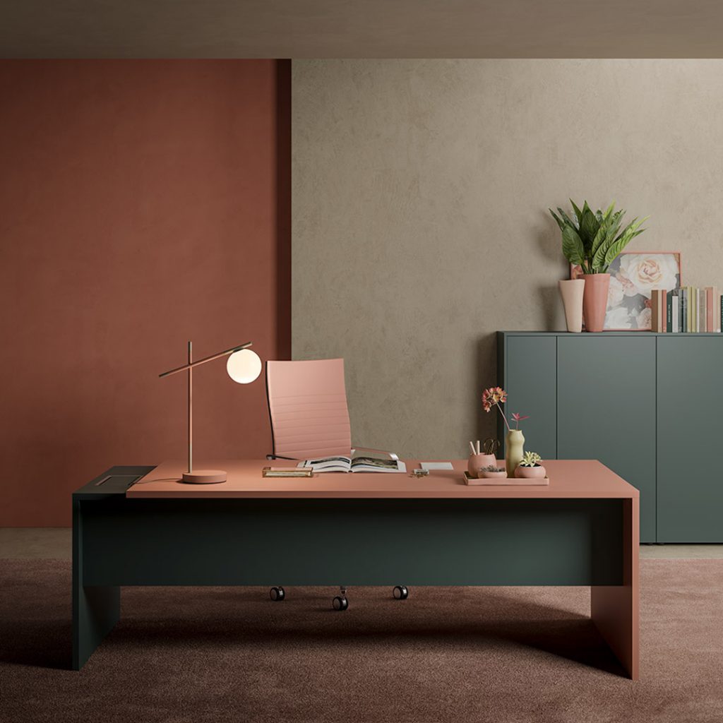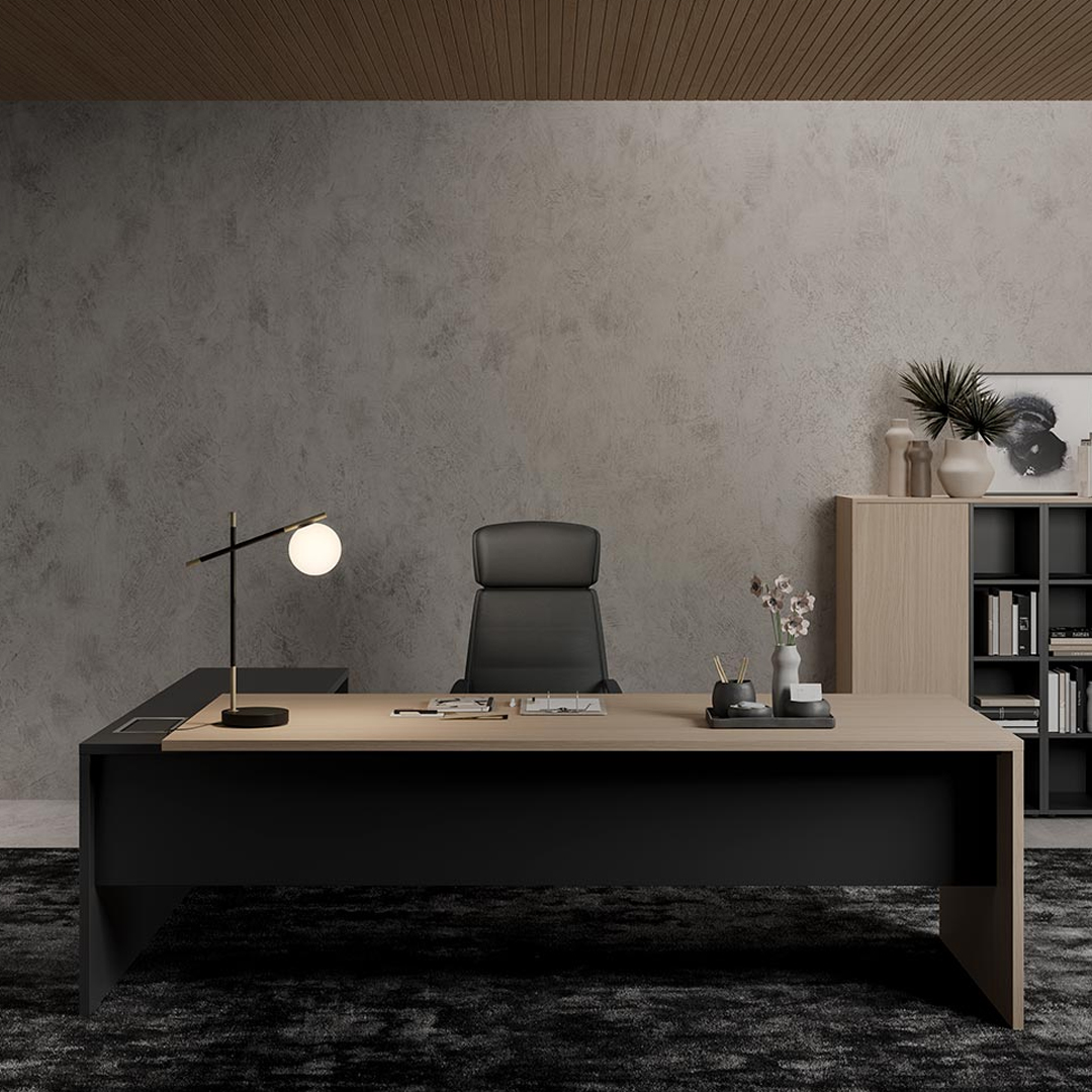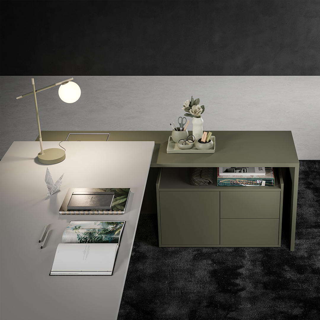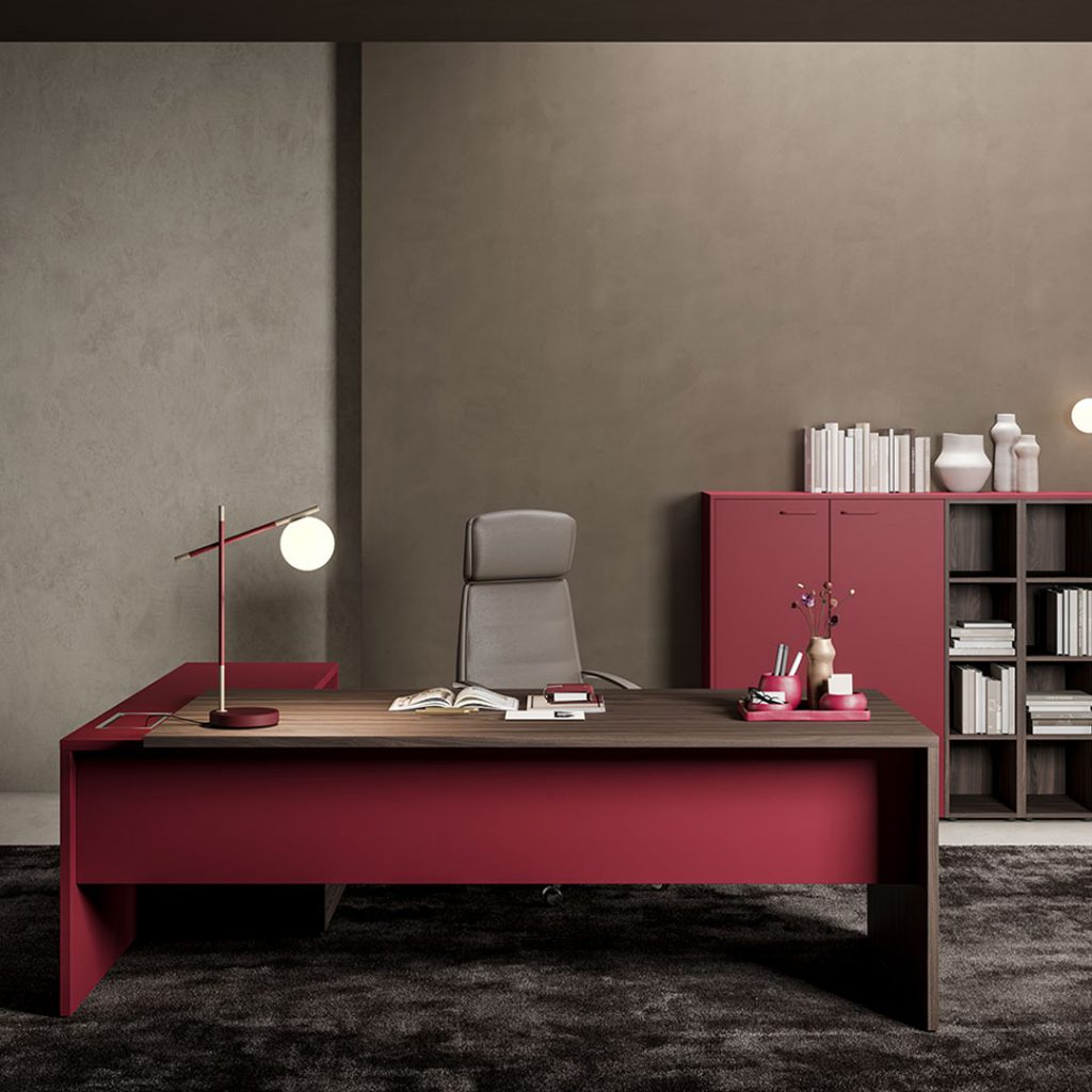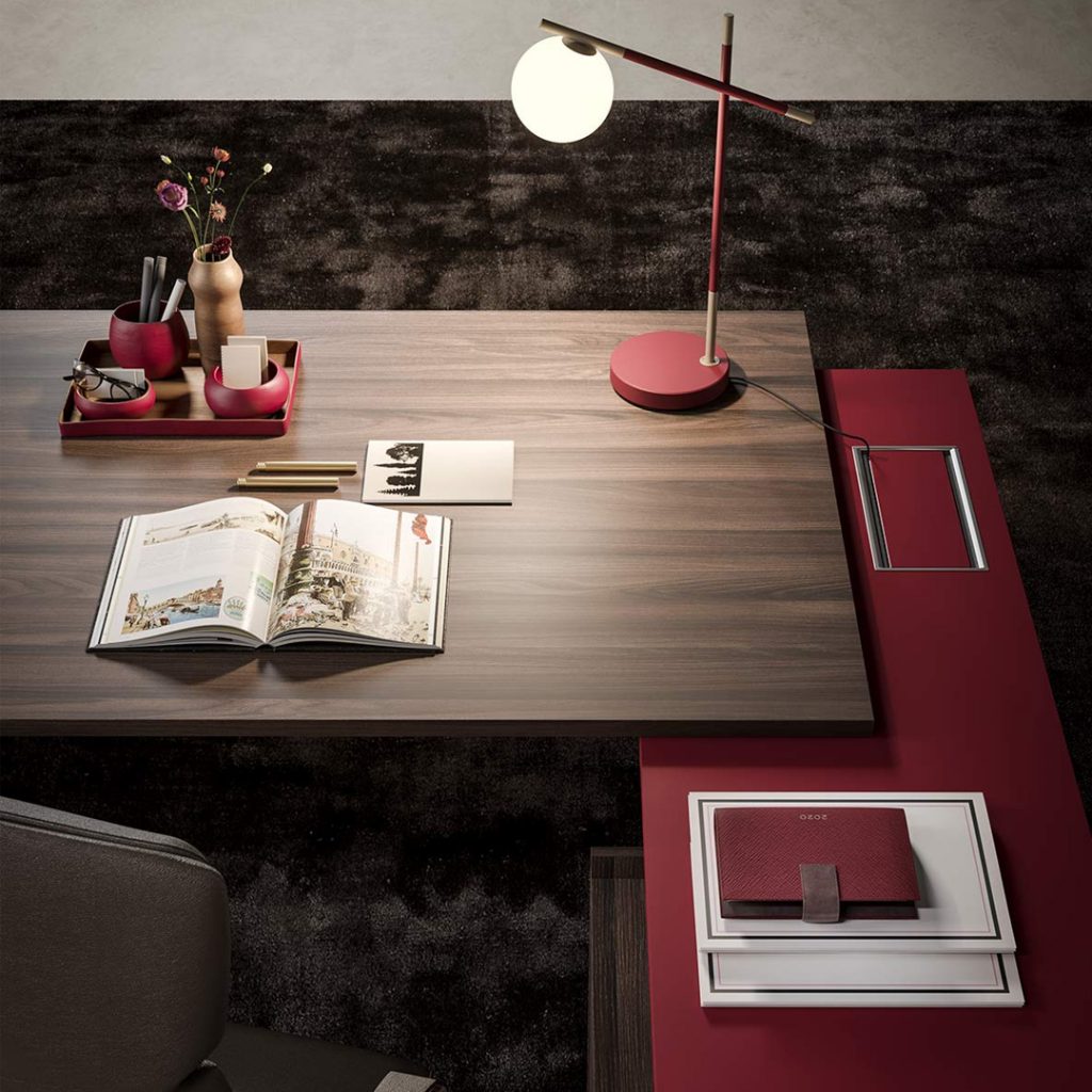 La scrivania è caratterizzata da una struttura e un piano in legno disponibile in melaminico, laccato, Fenix e impiallacciato.