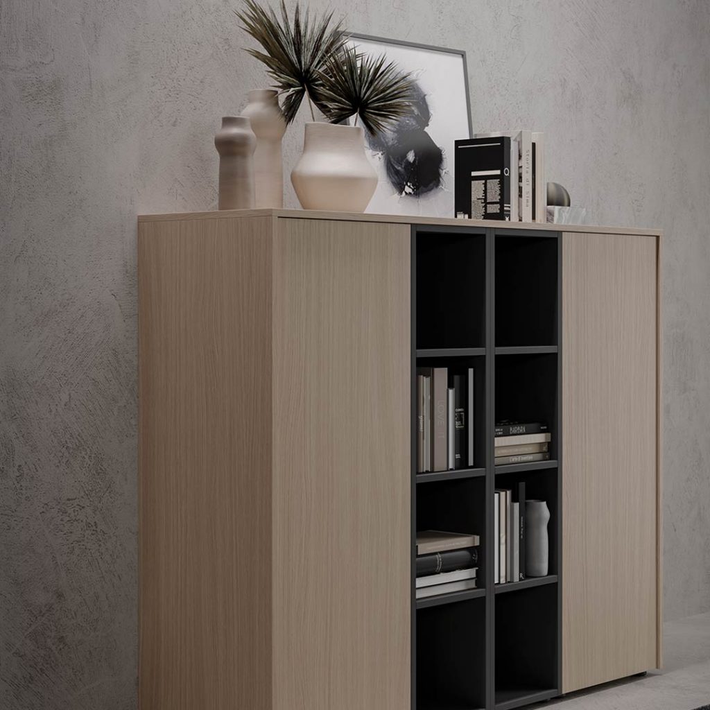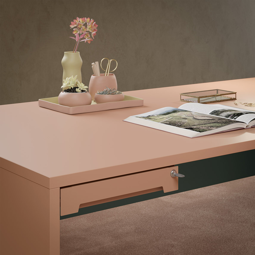 È prevista la configurazione semplice e quella con piano dattilo. Essenziale e funzionale, la scrivania è proposta tutta in legno con un gioco di tonalità a contrasto. Per un effetto monocromatico è possibile scegliere la versione in colore unico.
