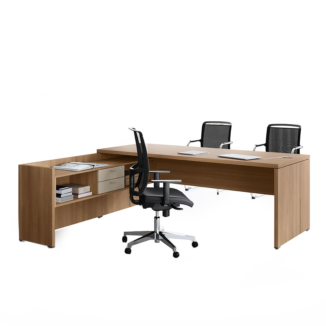 Le scrivanie sono di forma rettangolare e sono disponibili nella versione con basamento legno. Piani, fianchi e schiene di scrivanie sono realizzati con pannelli di particelle di legno spessore mm 35 nobilitati in melaminico. I piani e i fianchi sono rifiniti perimetralmente con bordo in ABS spessore mm 2 in tinta con la superficie.