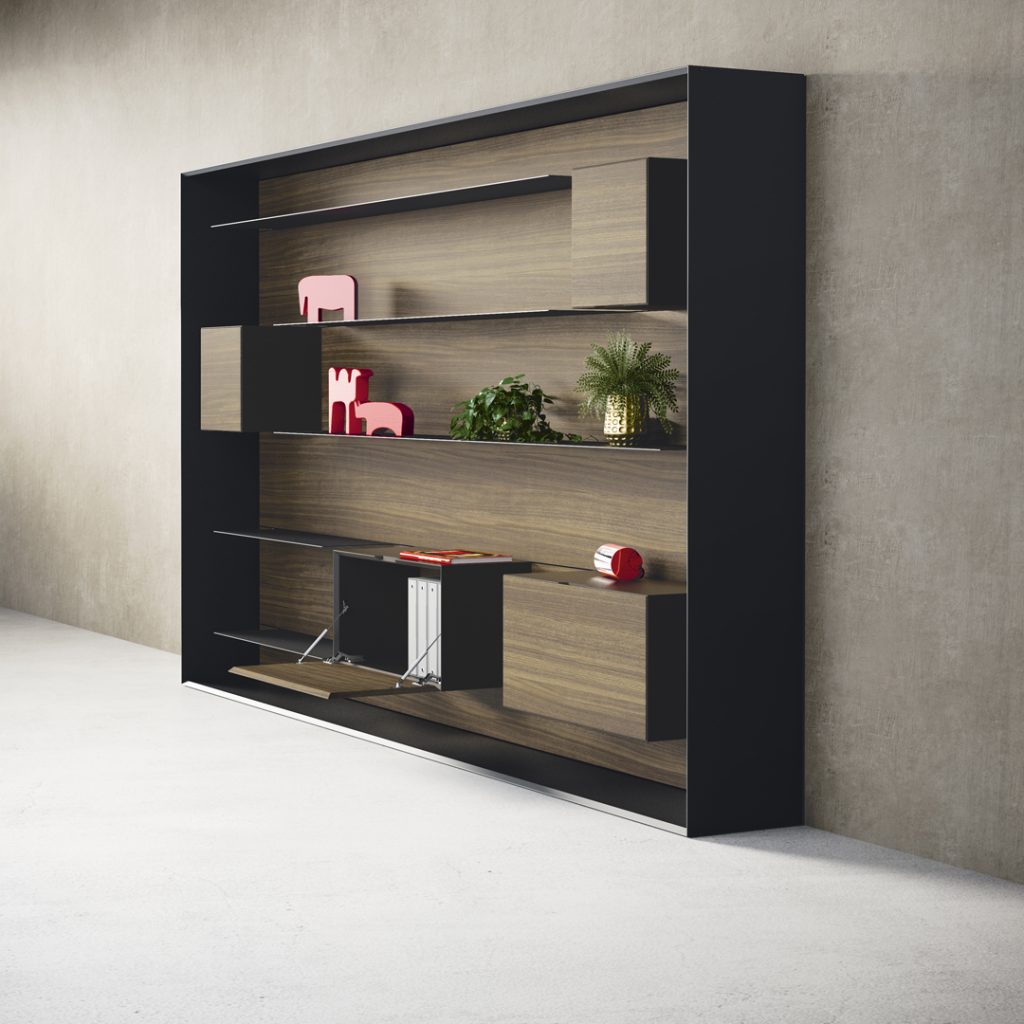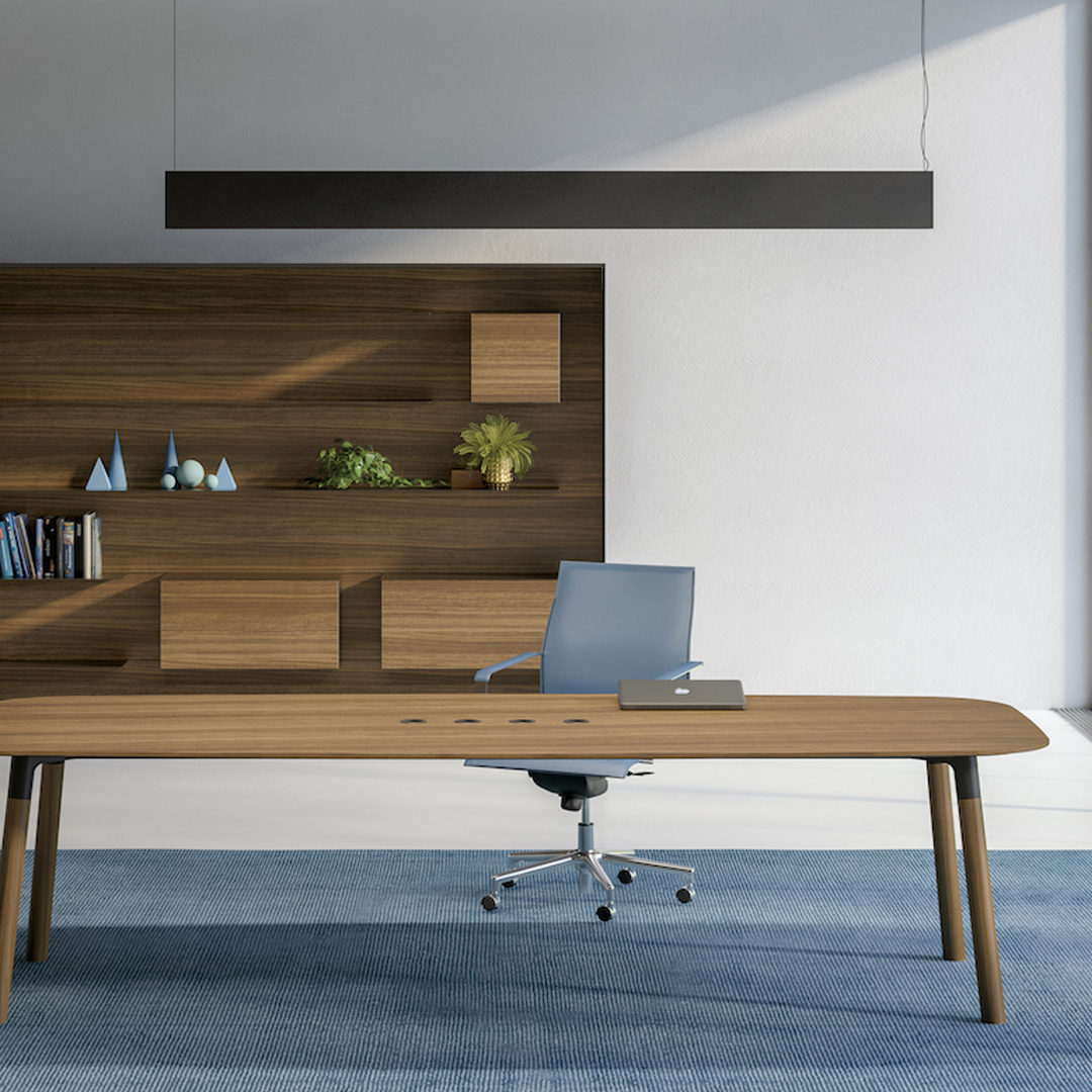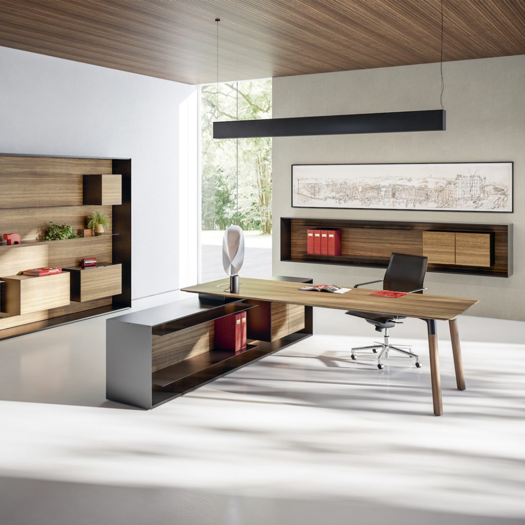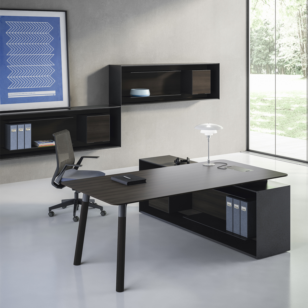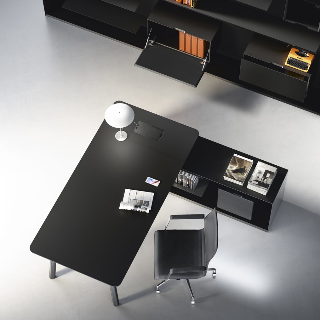 La sottile cornice definisce uno spazio geometrico, animato dai tagli orizzontali e dai volumi di mensole in acciaio e pensili in legno. Disponibile nelle versioni libreria a parete, pensile e sideboard, il sistema soddisfa le esigenze estetiche e funzionali dell’ufficio direzionale contemporaneo.