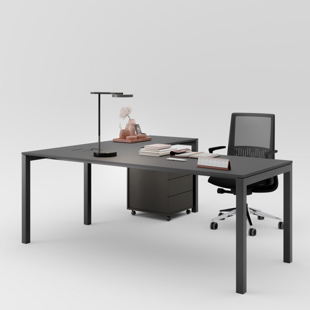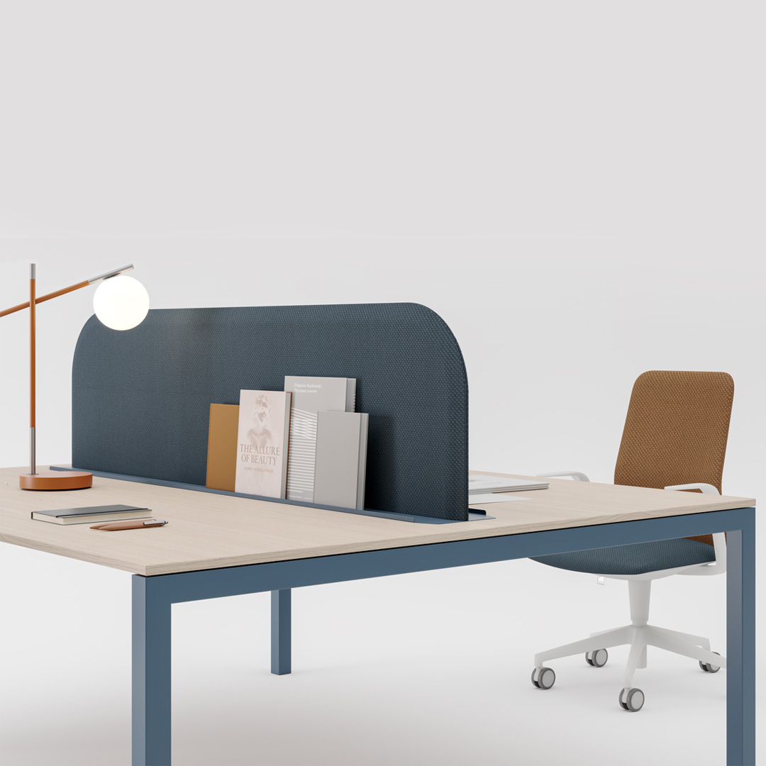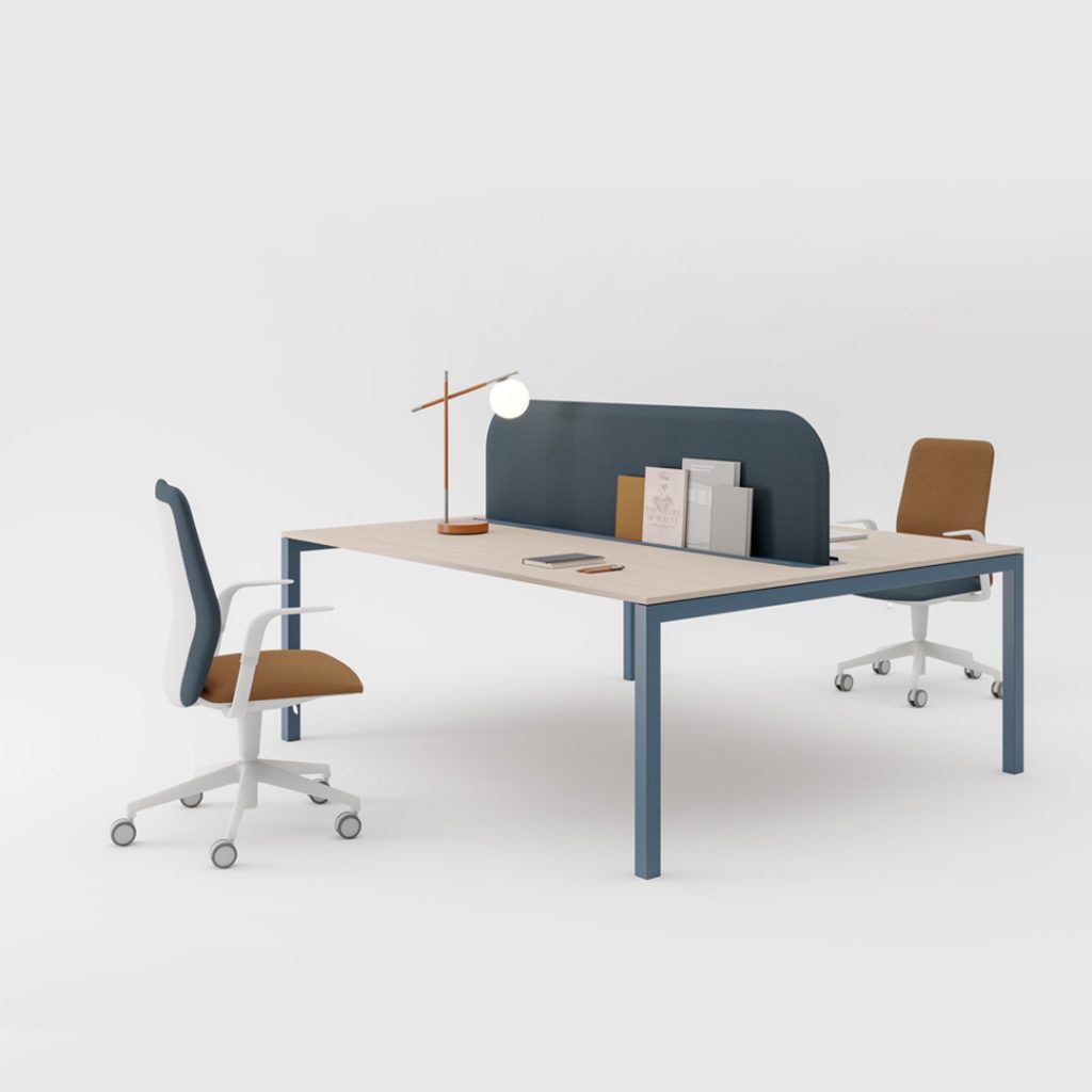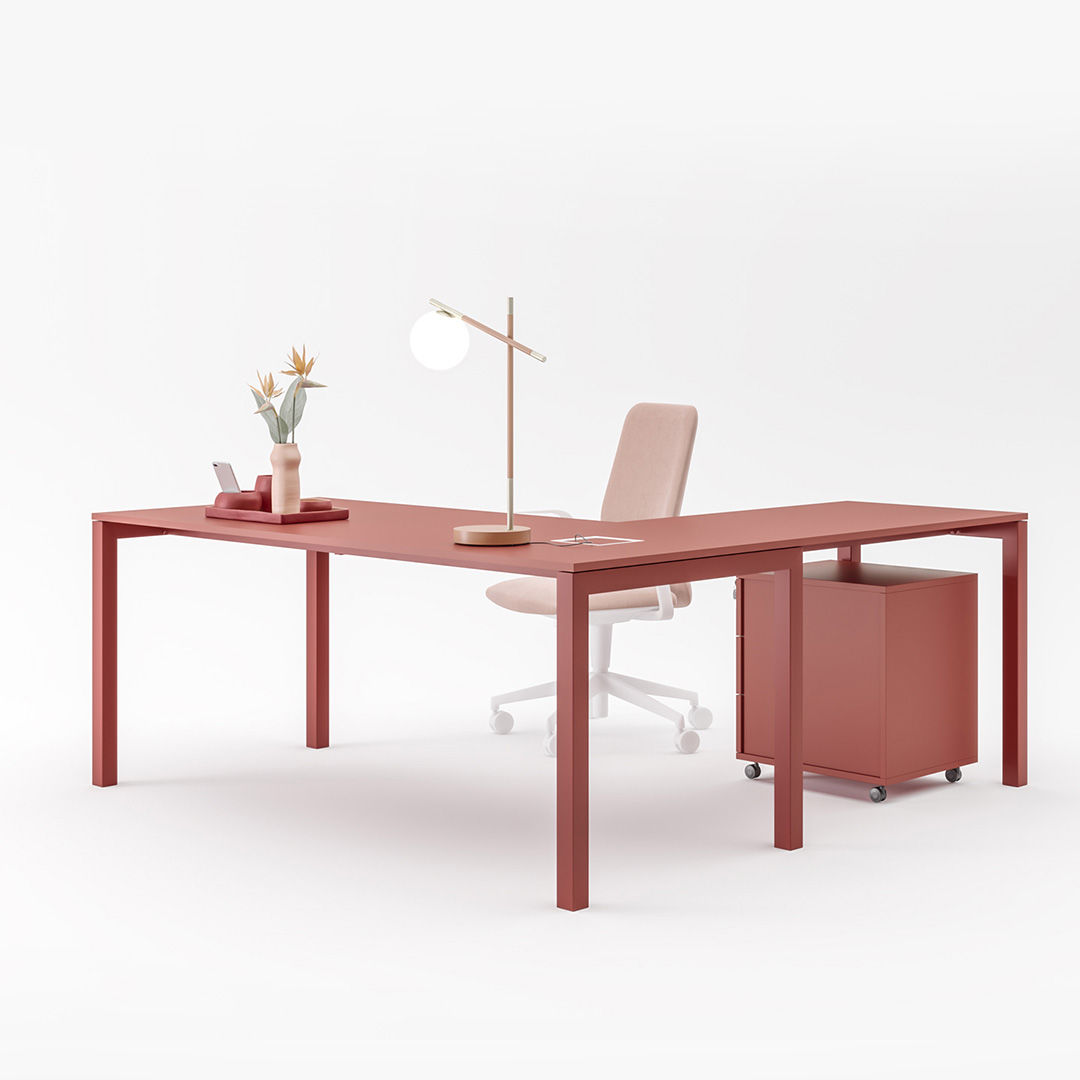 Ha una struttura metallica verniciata opaca disponibile in una vasta gamma di tonalità. Ampia la proposta di materiali e colori anche per il piano, che può essere in melaminico, vetro laccato anti touch e brillante in tinta unita o stampato effetto marmo, laccato, Fenix e legno impiallacciato.