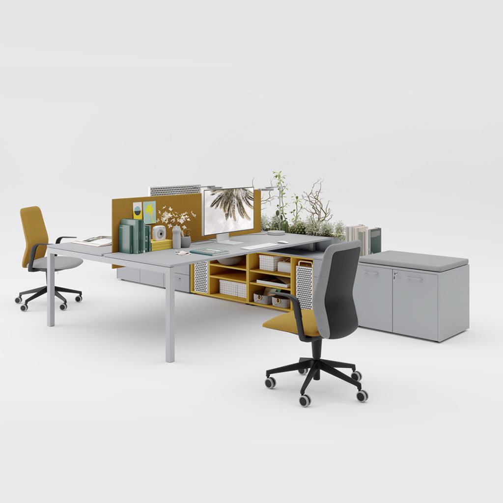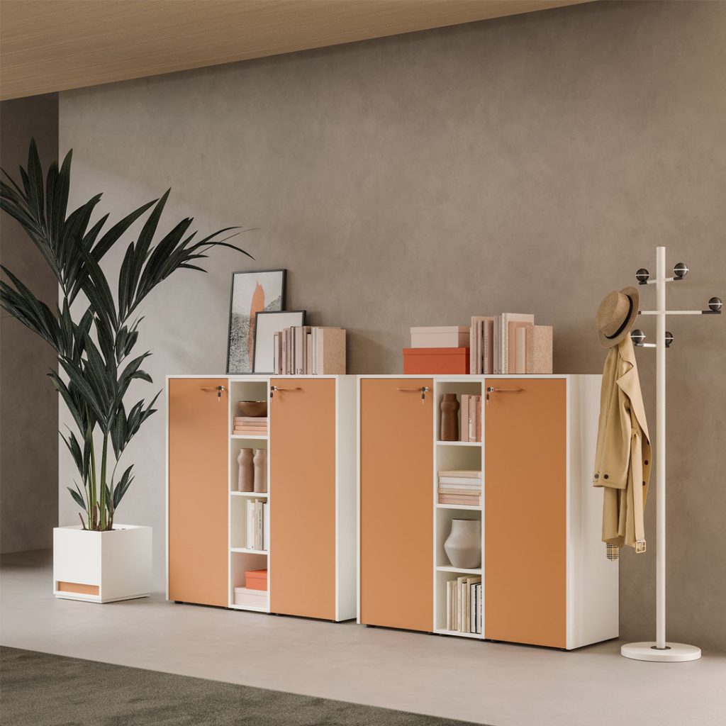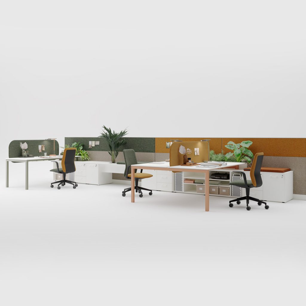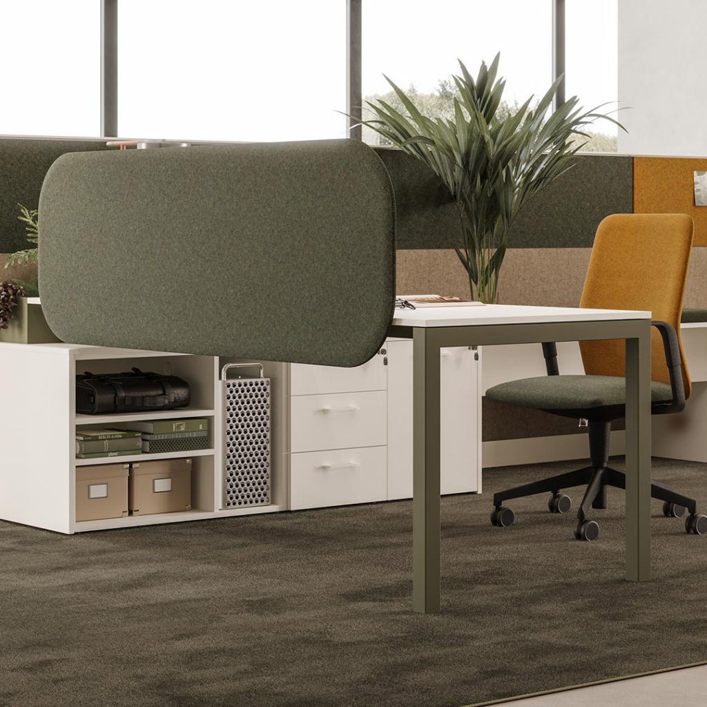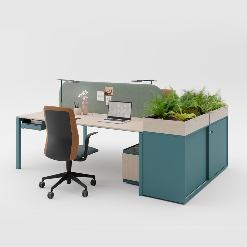 Le postazioni operative si abbinano facilmente al Mobile di Servizio portante, che funge da comodo archivio e piano di appoggio per accessori come il box porta piante in legno o il cuscino.