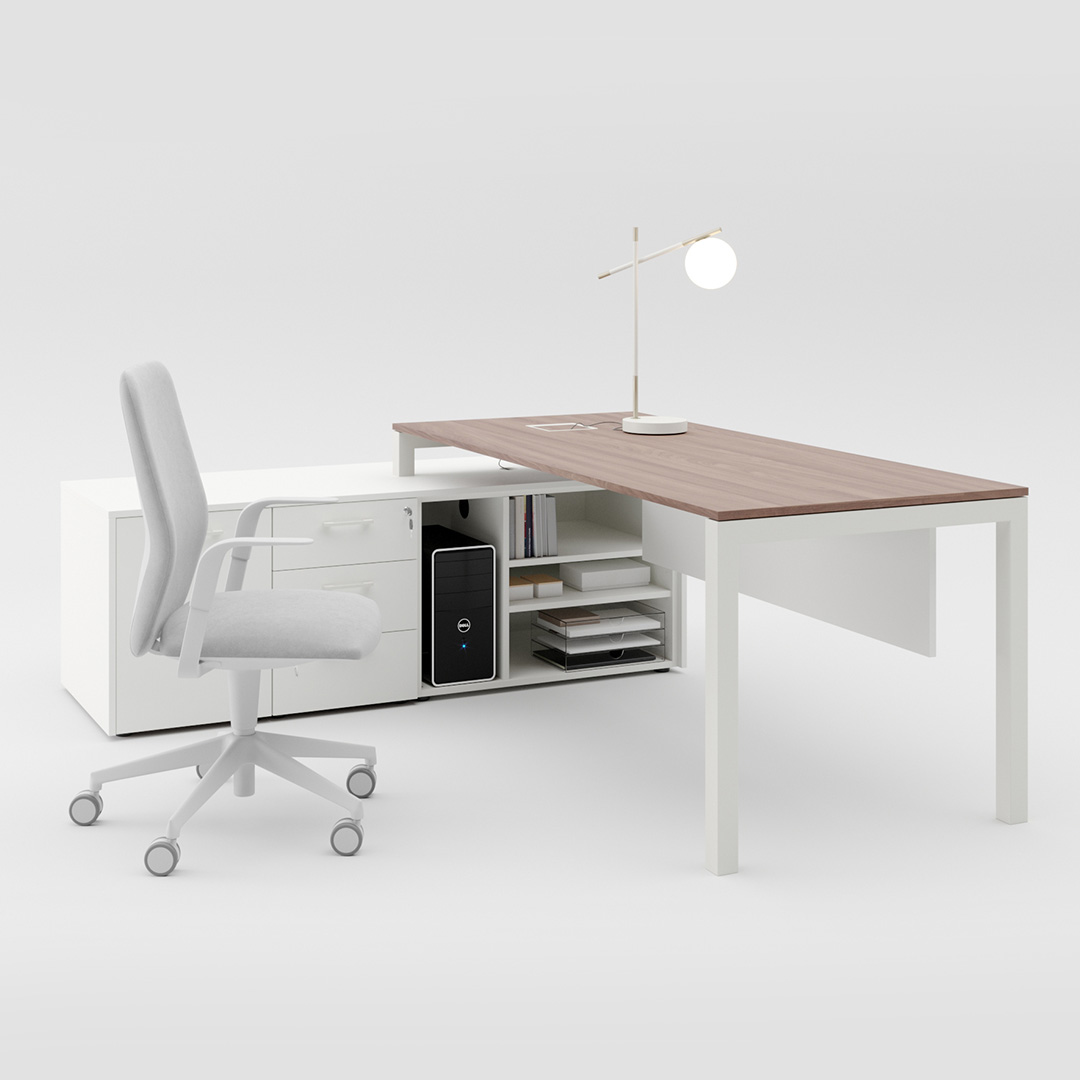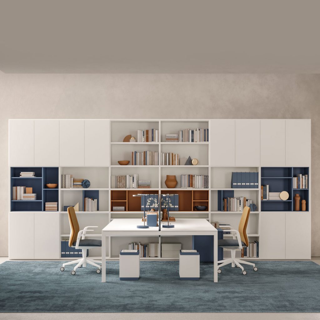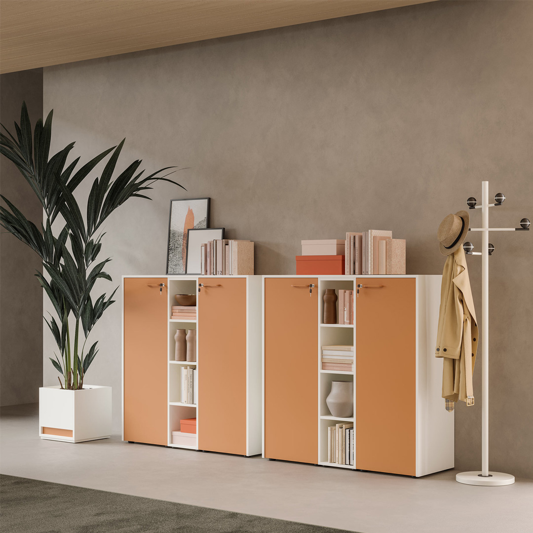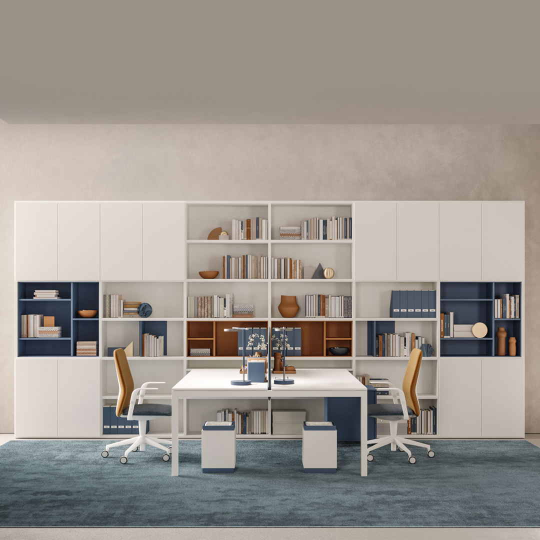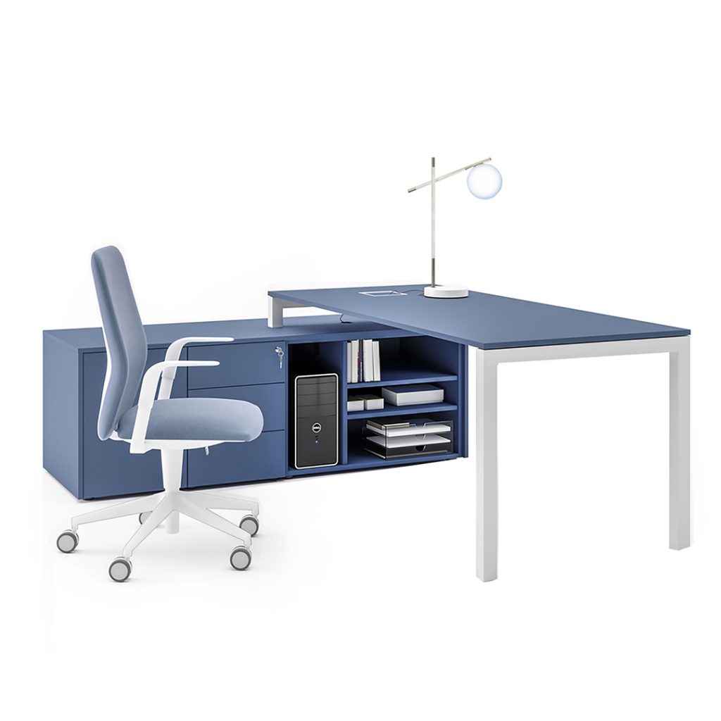 Il mobile allungo è composto da elementi modulari liberamente accostabili tra loro in profondità 600 mm e in due larghezze 416 mm e 832 mm. Si possono scegliere vani a giorno, tra cui il porta CPU canalizzato e vani chiusi da ante o cassetti, dotati di serratura con maniglie o premi e apri. È disponibile anche il modulo con vani a giorno di testa iniziale o finale e il modulo Bridge in varie lunghezze, che è una panca attrezzabile con passacavi, caricatore wireless, vasca metallica porta piante ad incasso e cuscino.