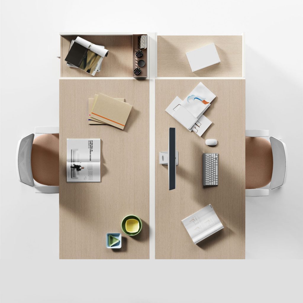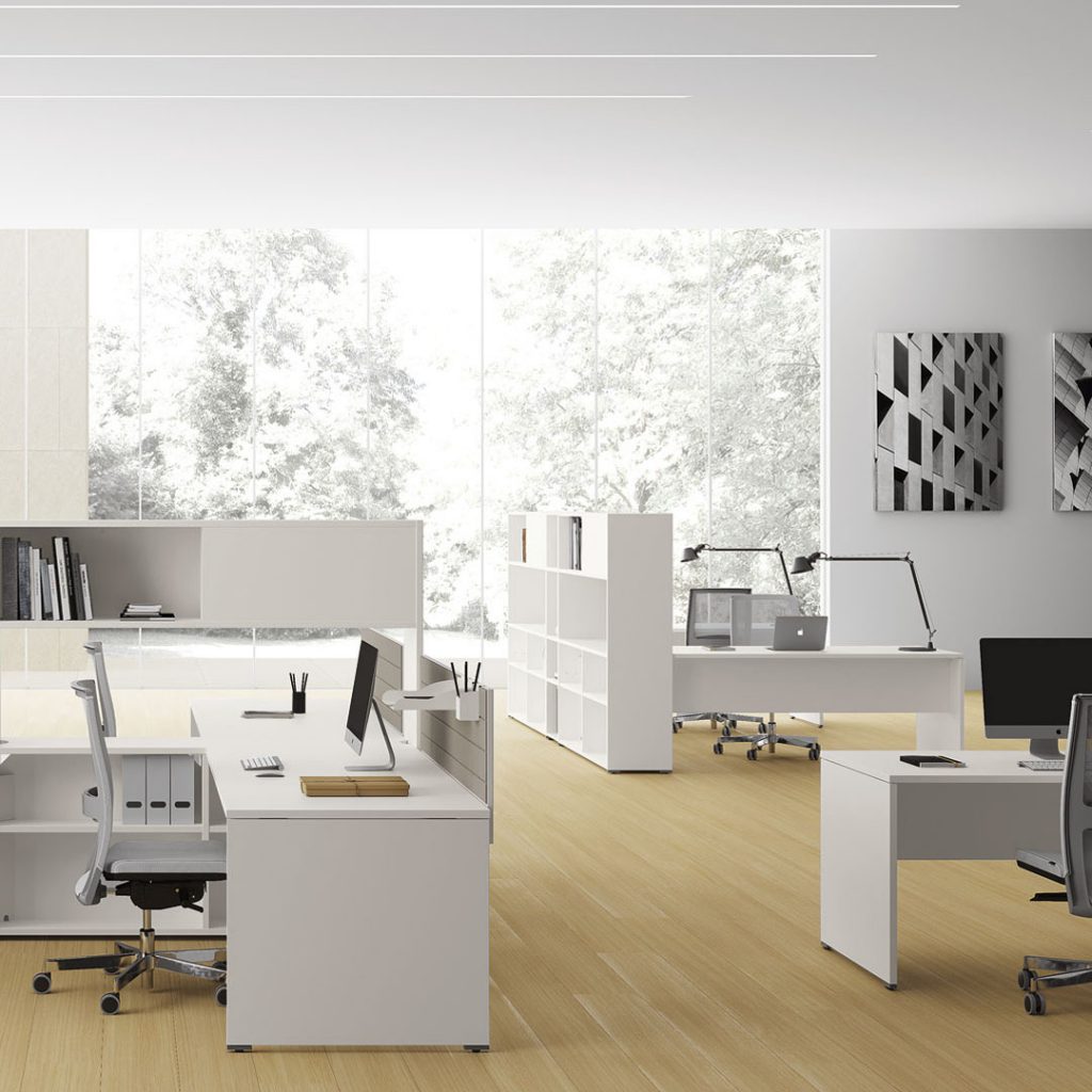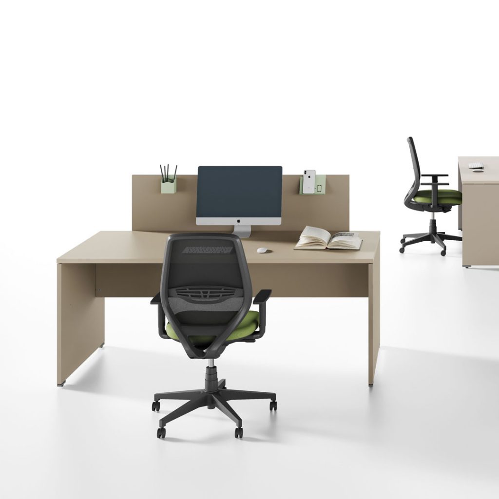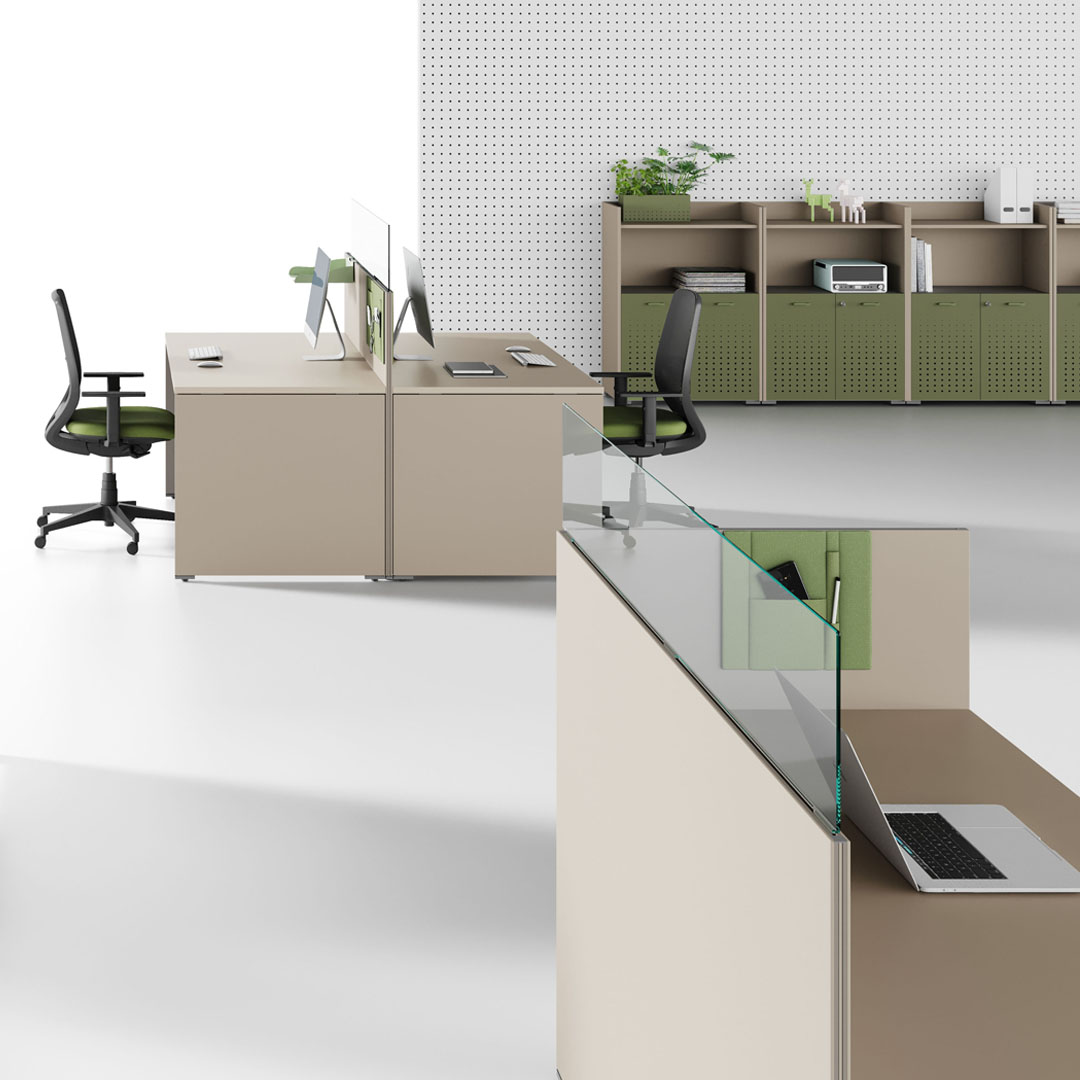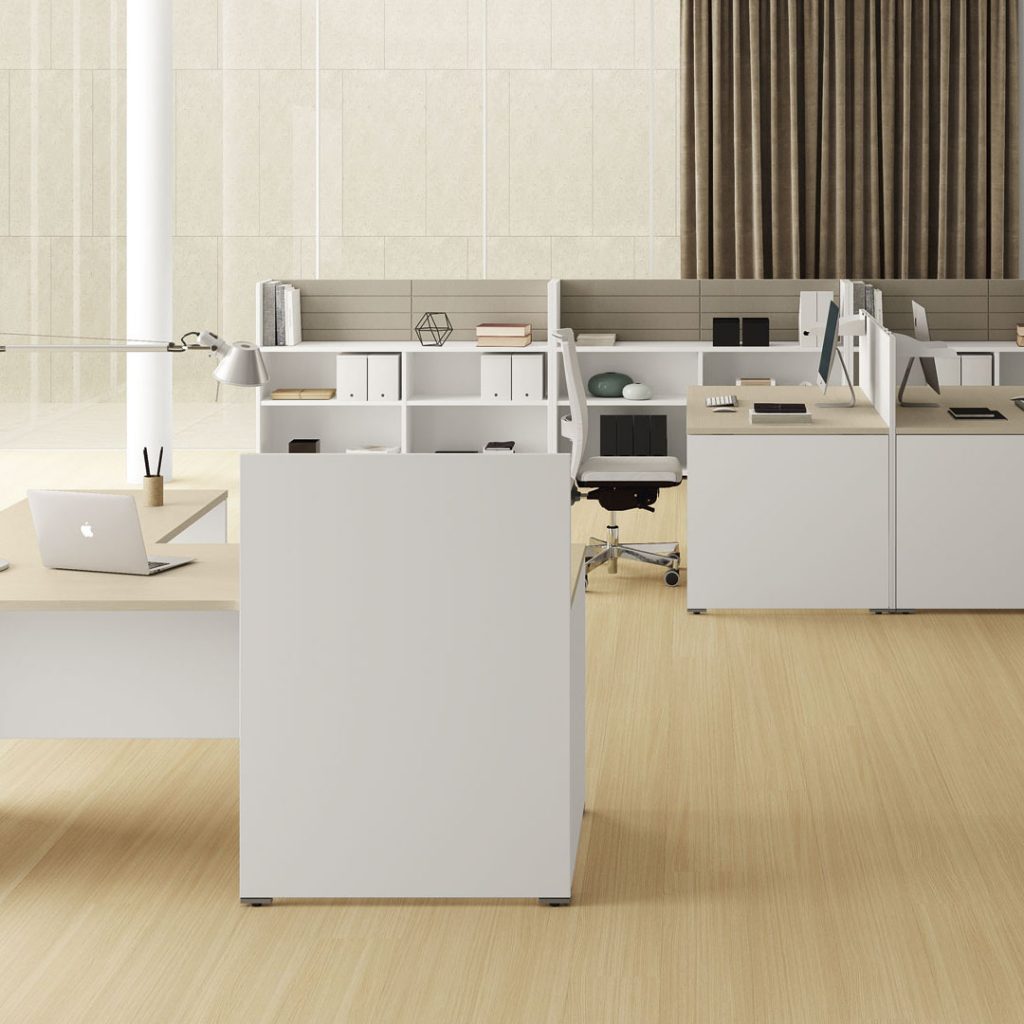 Tra i piani di lavoro e i fianchi delle scrivanie viene applicato un distanziale di spessore mm 4 realizzato in ABS. I fianchi sono completi di scarpette in ABS che permettono l’innesto di piedini registrabili. I piani dei bench pannellati sono dotati di top-access e nella parte sottostante vengono montate delle vaschette metalliche che permettono l’alloggiamento dei cavi.