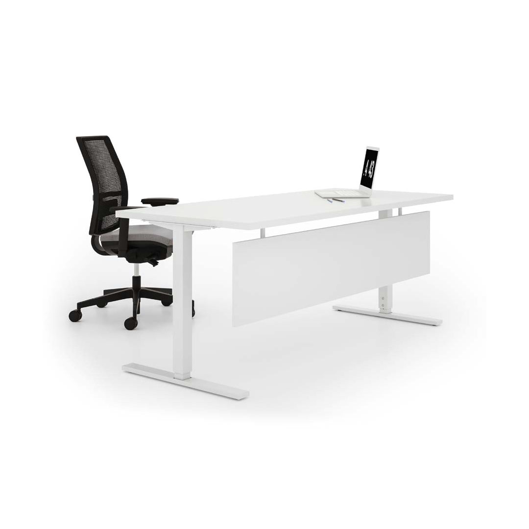 Il Piano scrivania in pannello di conglomerato ligneo sp. 30 mm, rivestito su entrambi i lati con carta melaminica antiriflesso, antigraffio e lavabile. Bordatura sui 4 lati in ABS antiurto, in tinta, sp. 2 mm. Densità del pannello: 670/730 kg/m3