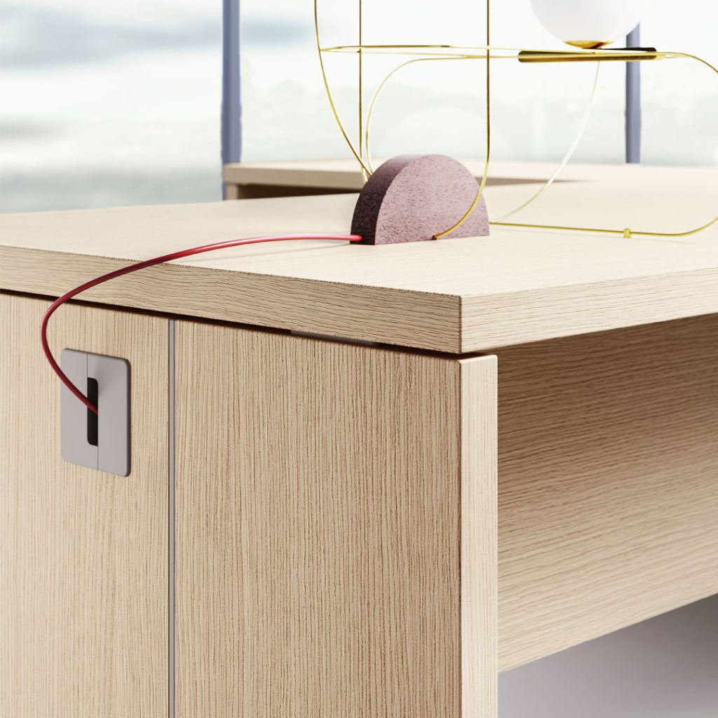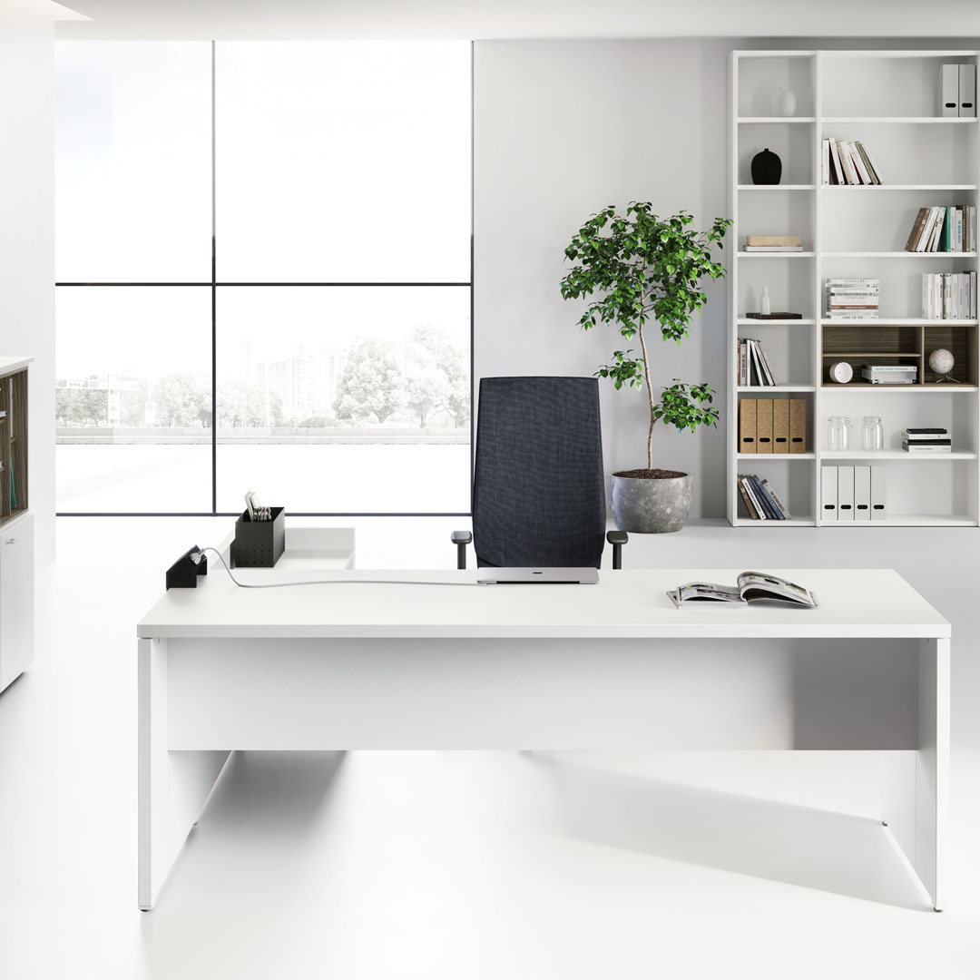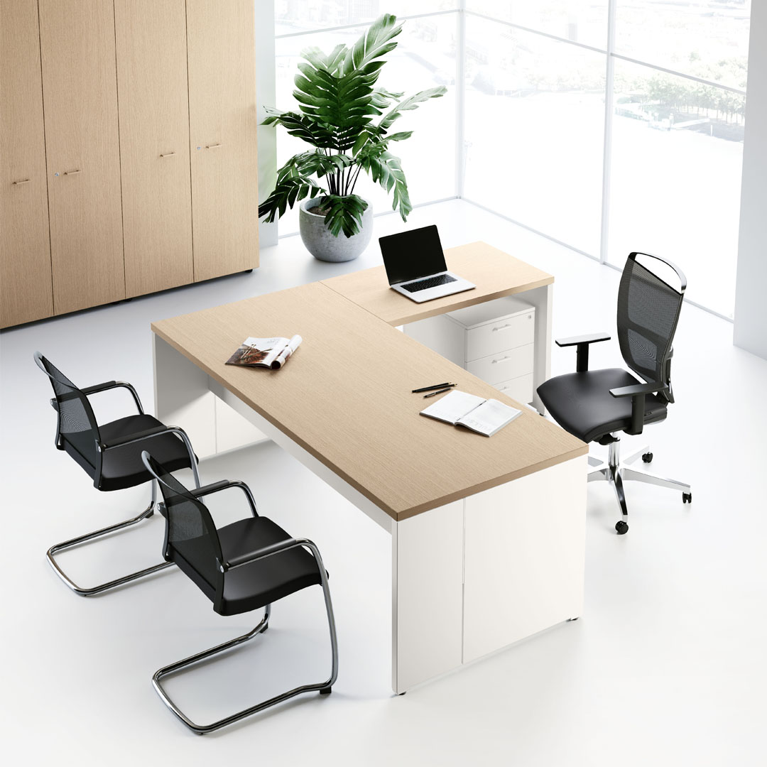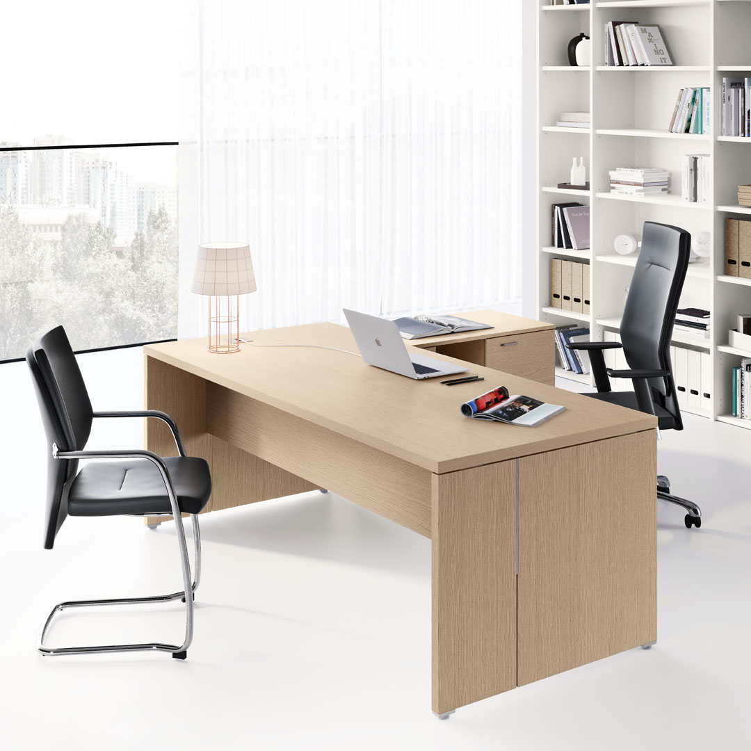 Le scrivanie sono di forma rettangolare e sono disponibili nella versione con basamento legno. Piani, fianchi e schiene di scrivanie sono realizzati con pannelli di particelle di legno spessore mm 35 nobilitati in melaminico. I piani e i fianchi sono rifiniti perimetralmente con bordo in ABS spessore mm 2 in tinta con la superficie.