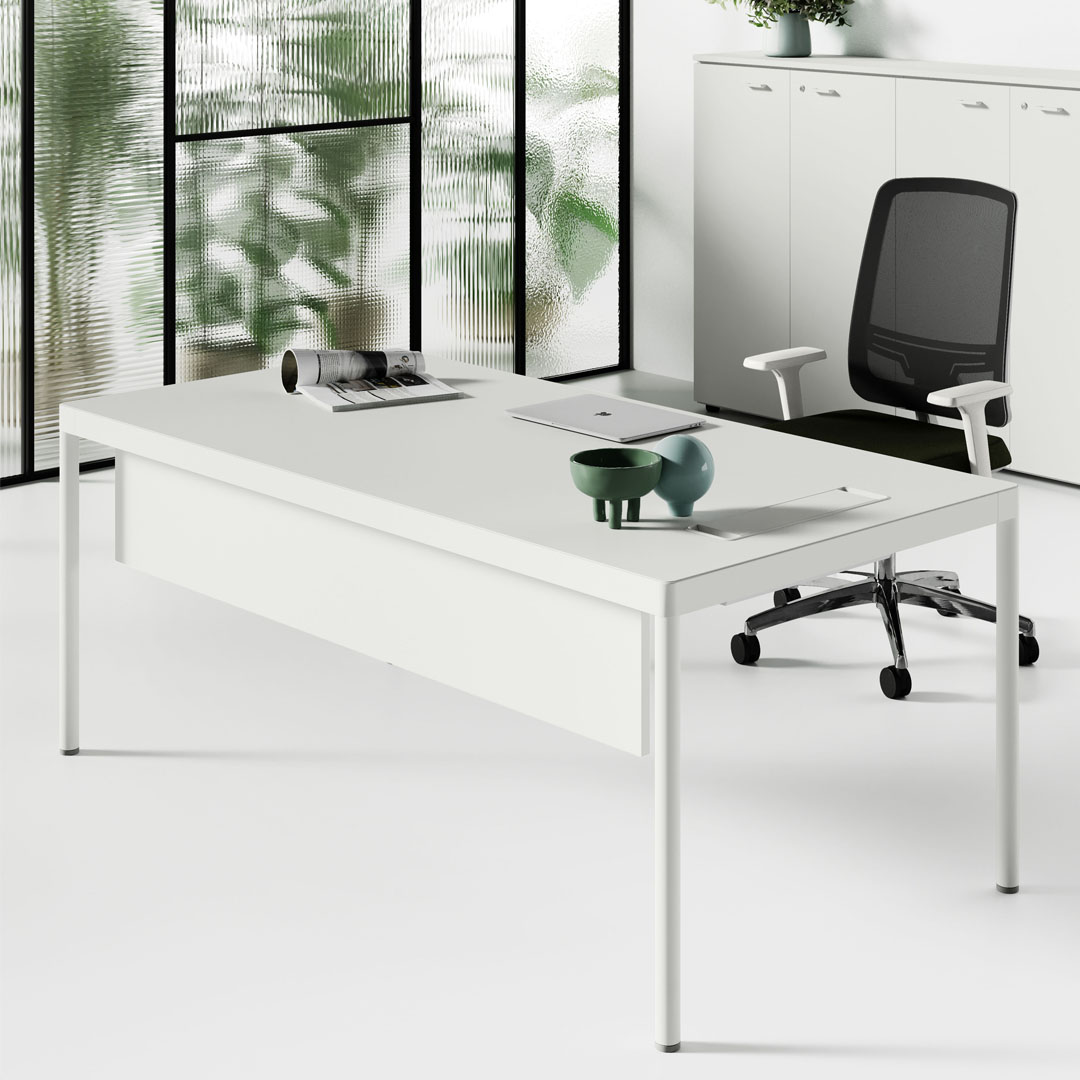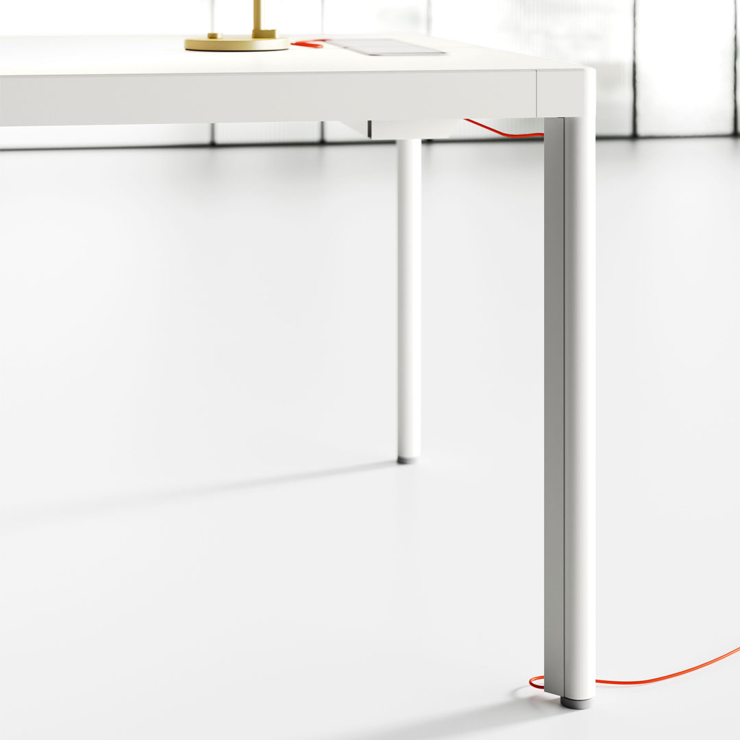Le Gambe sono in profilato metallico. Il Piano è incassato a filo struttura e si può avere scorrevole, per accesso al vano di cablaggio.