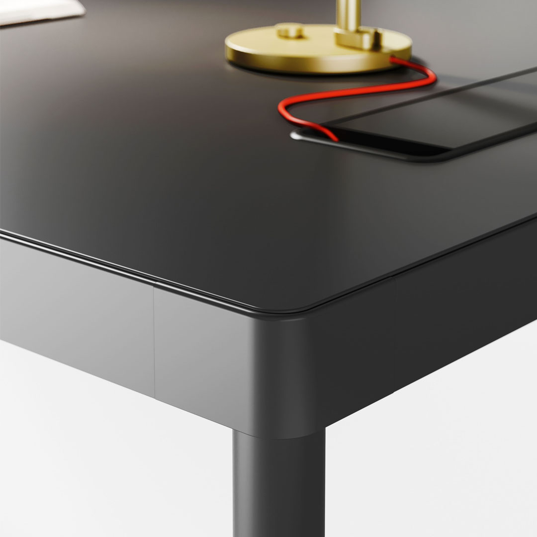 Gli angoli dei tavoli sono in alluminio pressofuso e collegano i profili perimetrali e il piano.