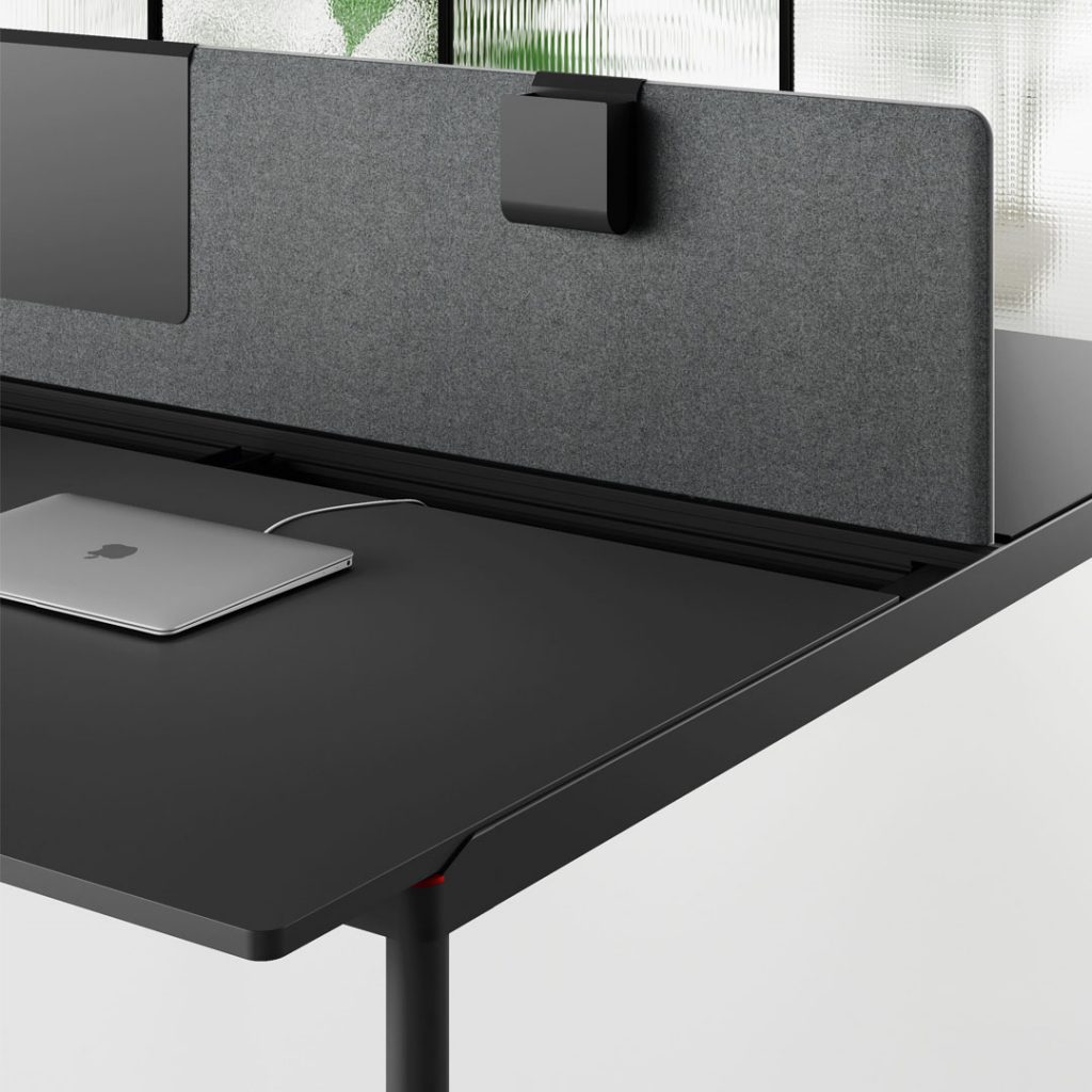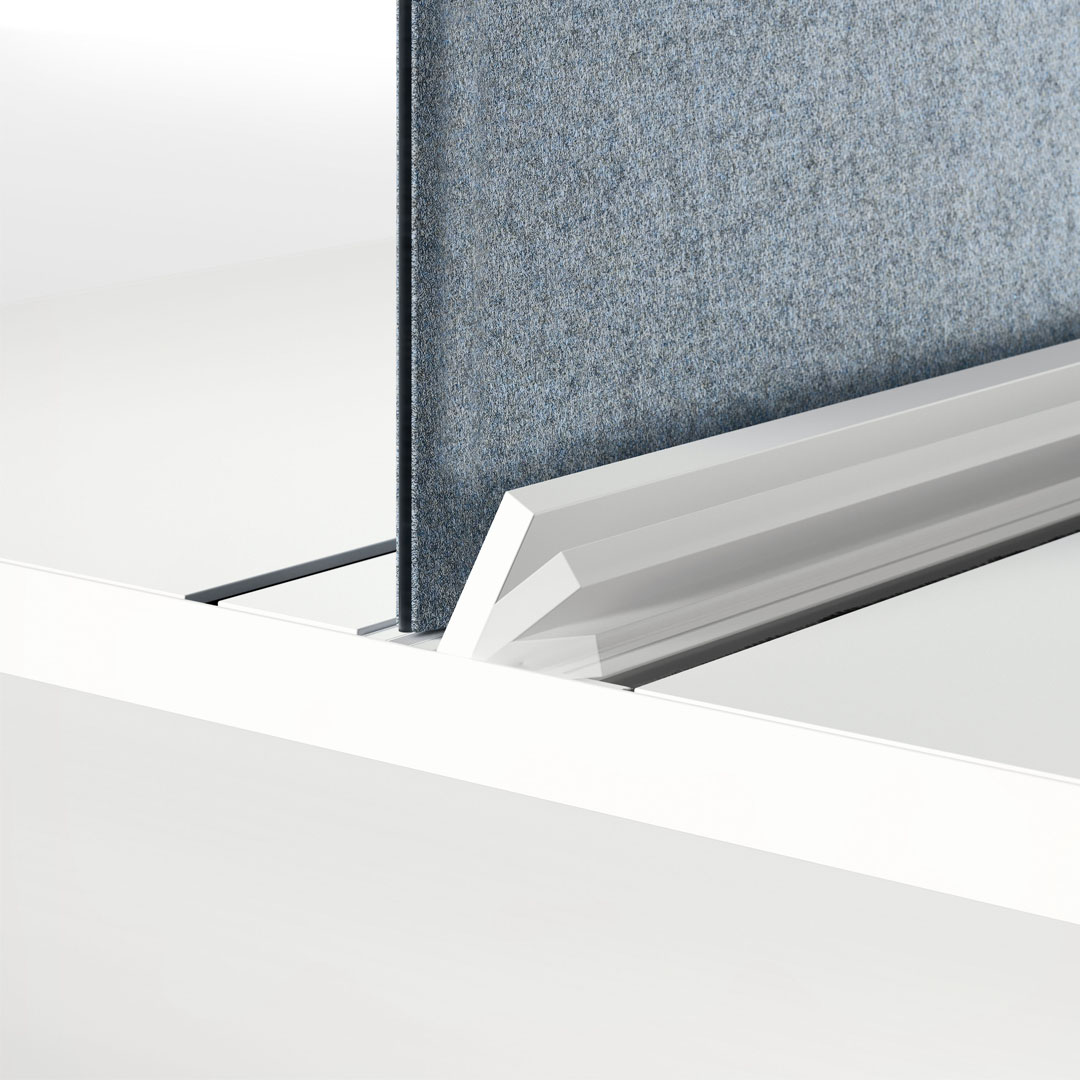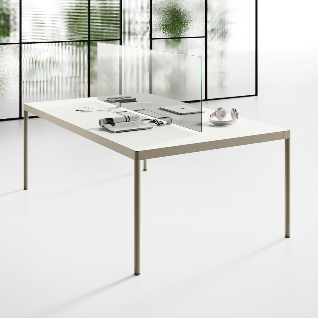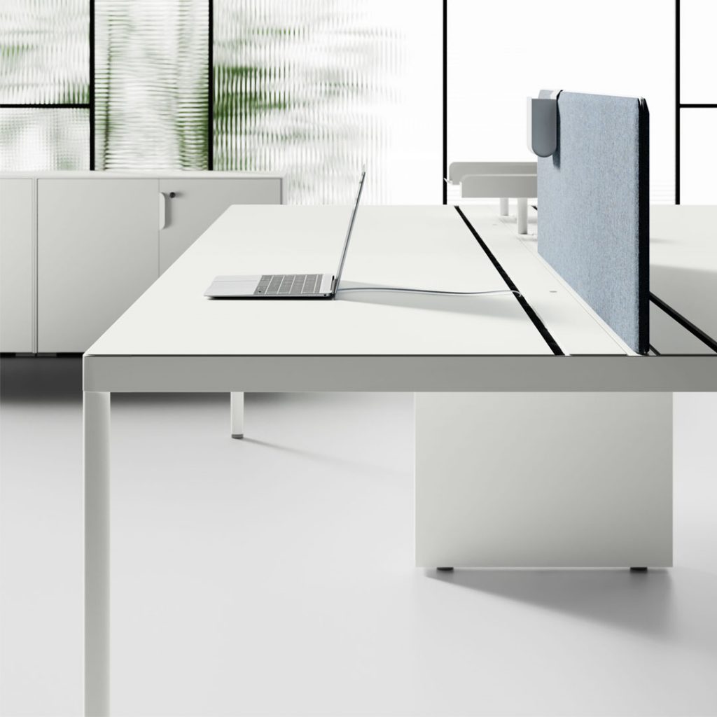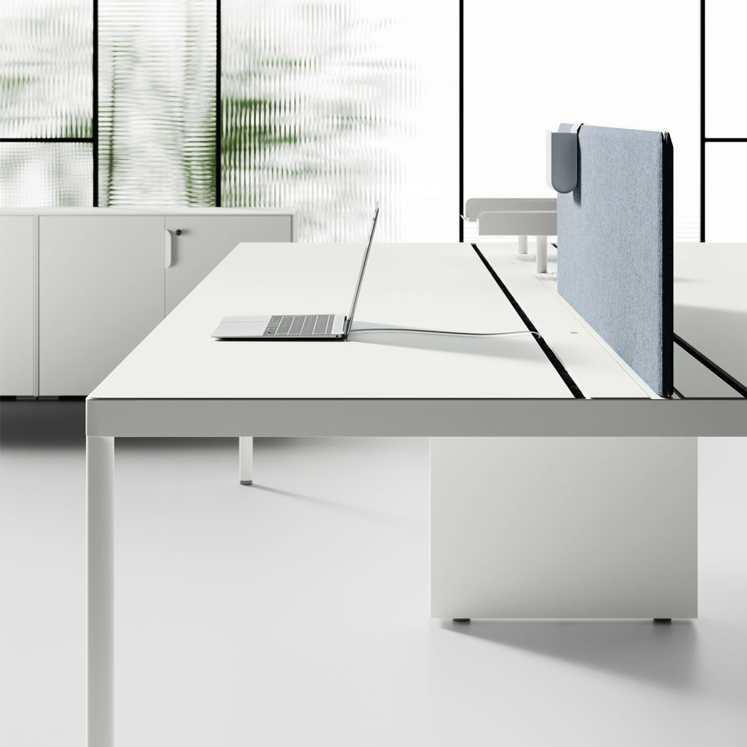 Le postazioni sono attrezzate con barre centrali utili al fissaggio di tutte le tipologie di schermi acustici a catalogo e di porta oggetti, di porta fogli, di bracci per schermi o per lampade da tavolo.