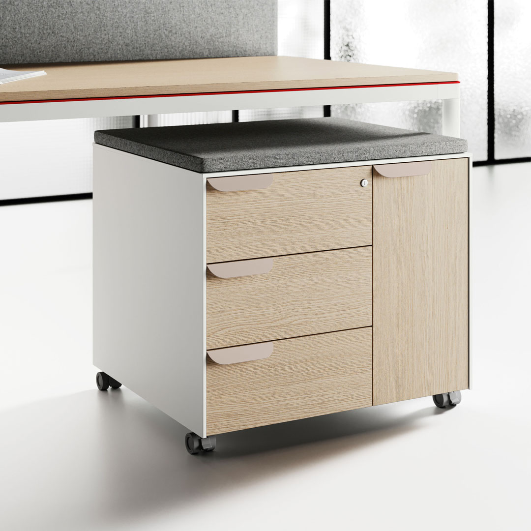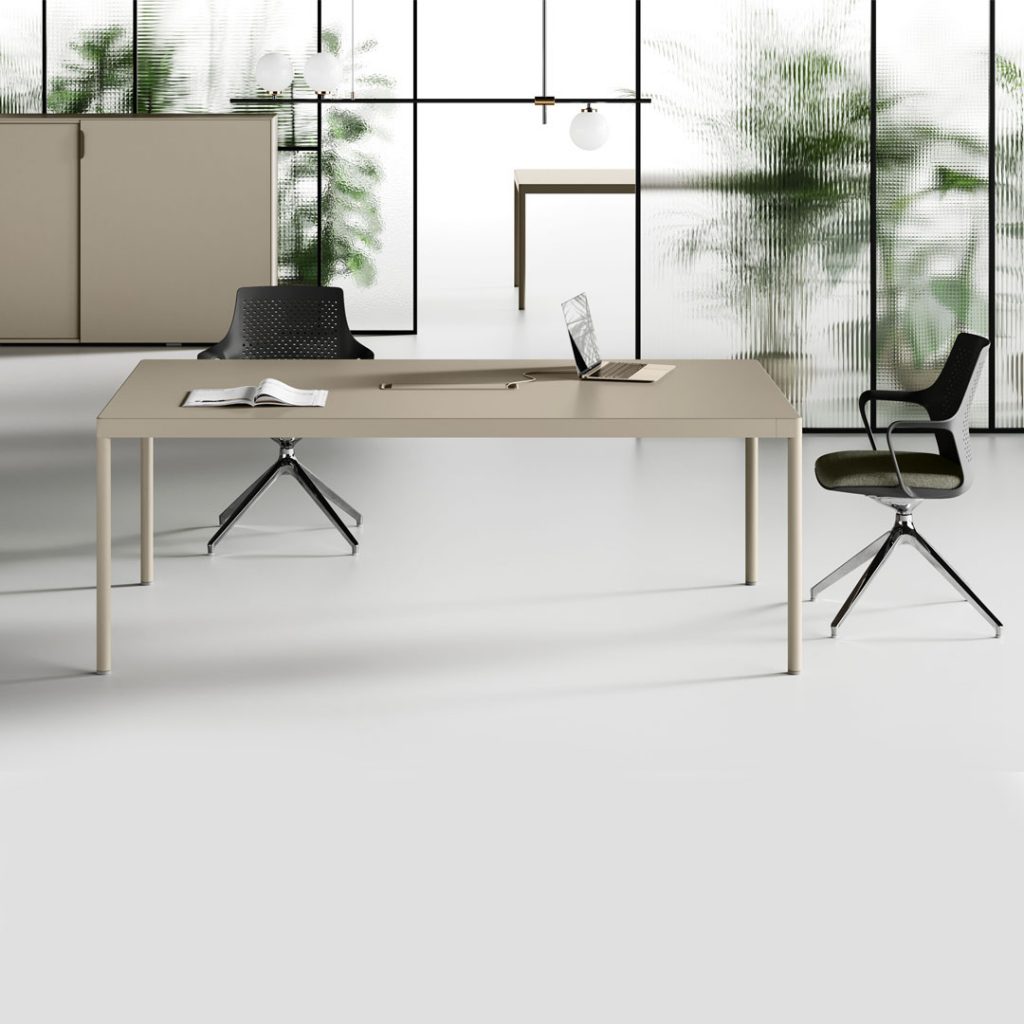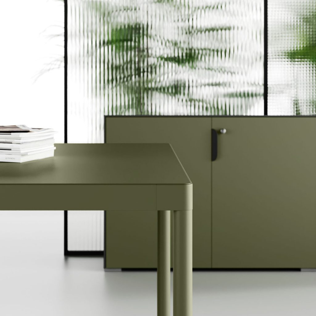 Le finiture dei melaminici è moderna ed accattivante e si aggiunge all’opportunità di scegliere i colori delle strutture metalliche, alle tipologie di tessuti per rivestimenti acustici, ai Pannelli divisori attrezzabili, alle Cassettiere ed ai mobili di servizio su ruote.