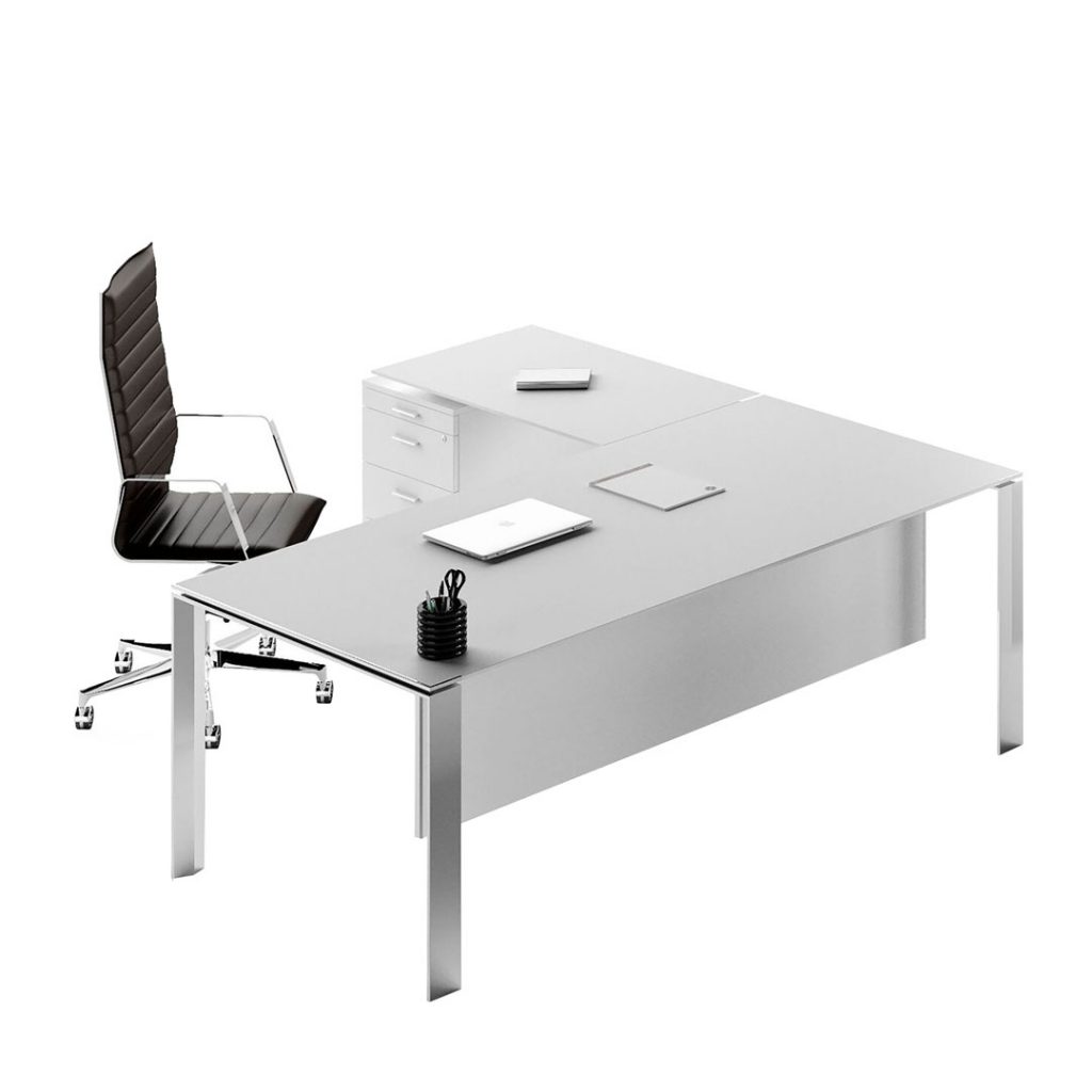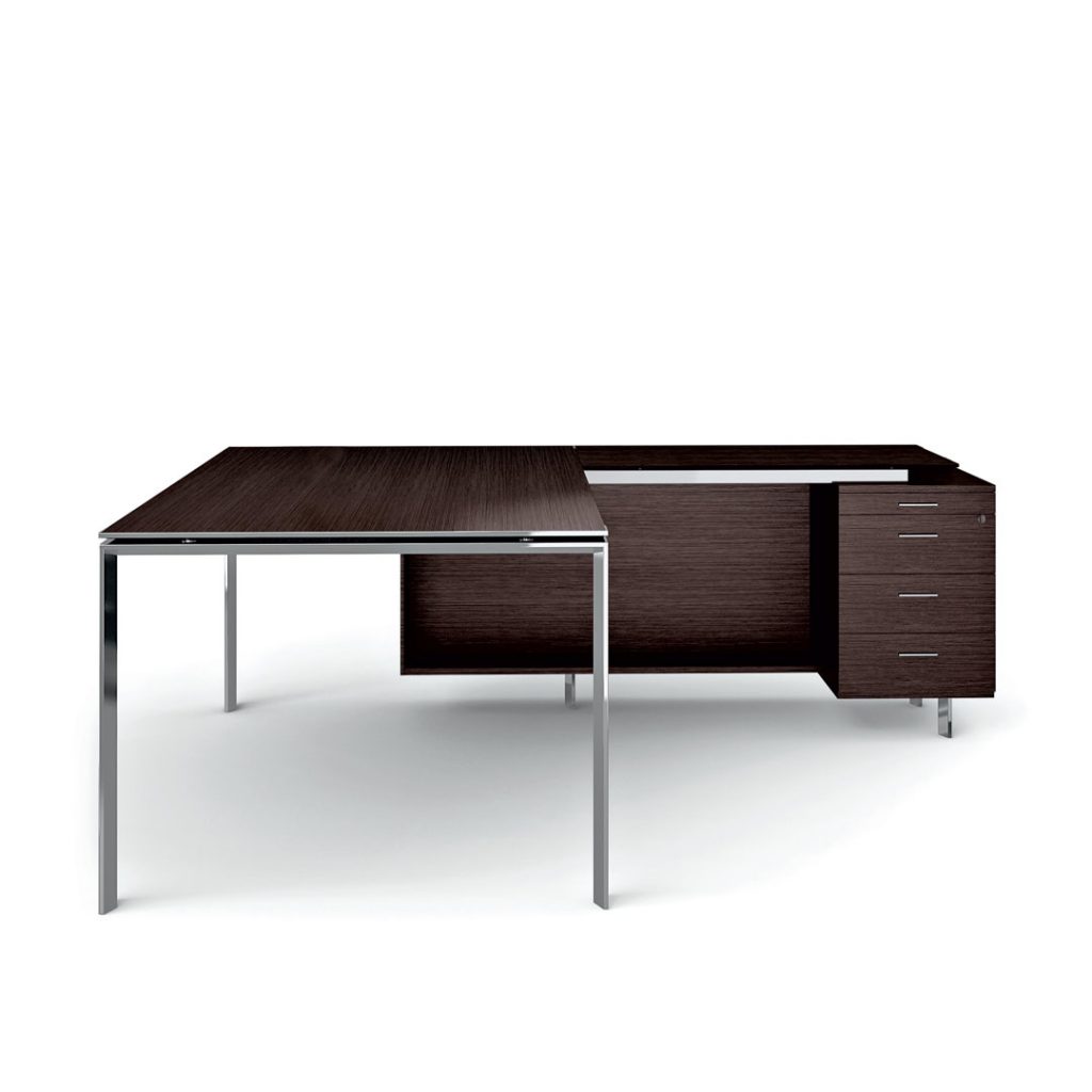 Il razionalismo riletto approda ad una armonia stilistica fatta di segni e tracciati. La gamba in generosa sezione tubolare, gli spessori minimi dei piani, determinano l’autorevolezza della scrivania. La scrivania riscopre le proporzioni. La leggerezza della struttura crea una forma senza tempo, trasmette solidità con leggerezza di un segno di classicità.