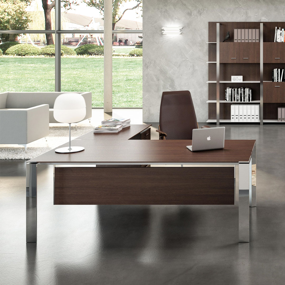 Innovativi accostamenti materici danno forma ad elementi d’arredo perfetti ed adattabili a qualsiasi ambiente. Il grande piano dilata e amplifica lo spazio. La scrivania vuol essere sintesi tra forma, materiali e tecnologia; grazie all’essenziale design ed all’utilizzo del cristallo in abbinamento alle essenze lignee.