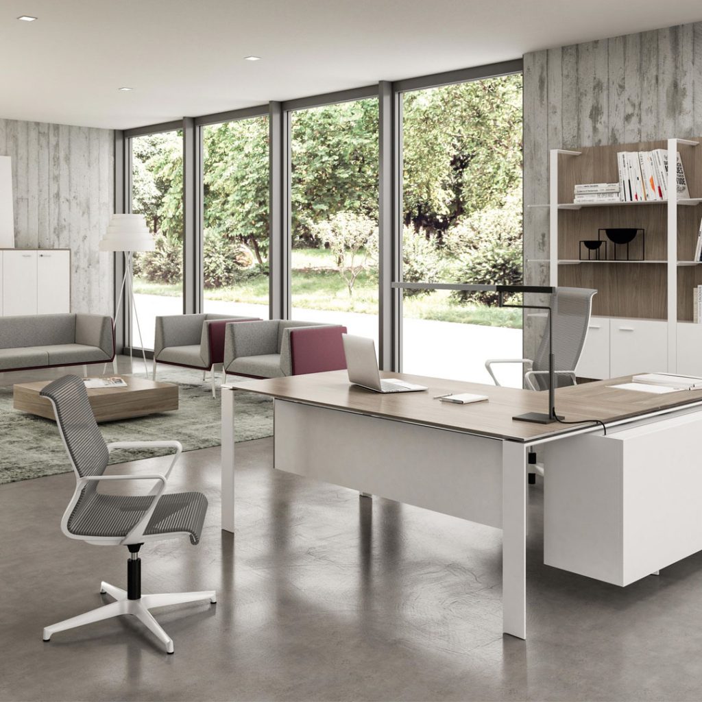 Piani scrivania e tavolo riunione in melaminico o in vetro.