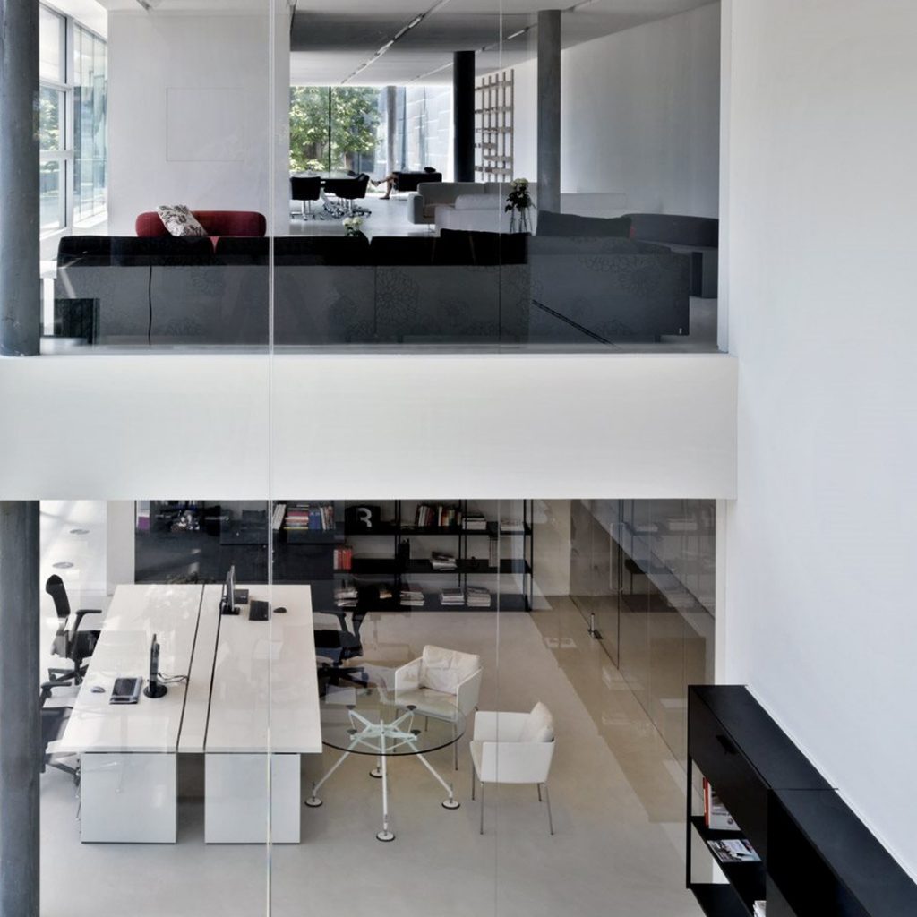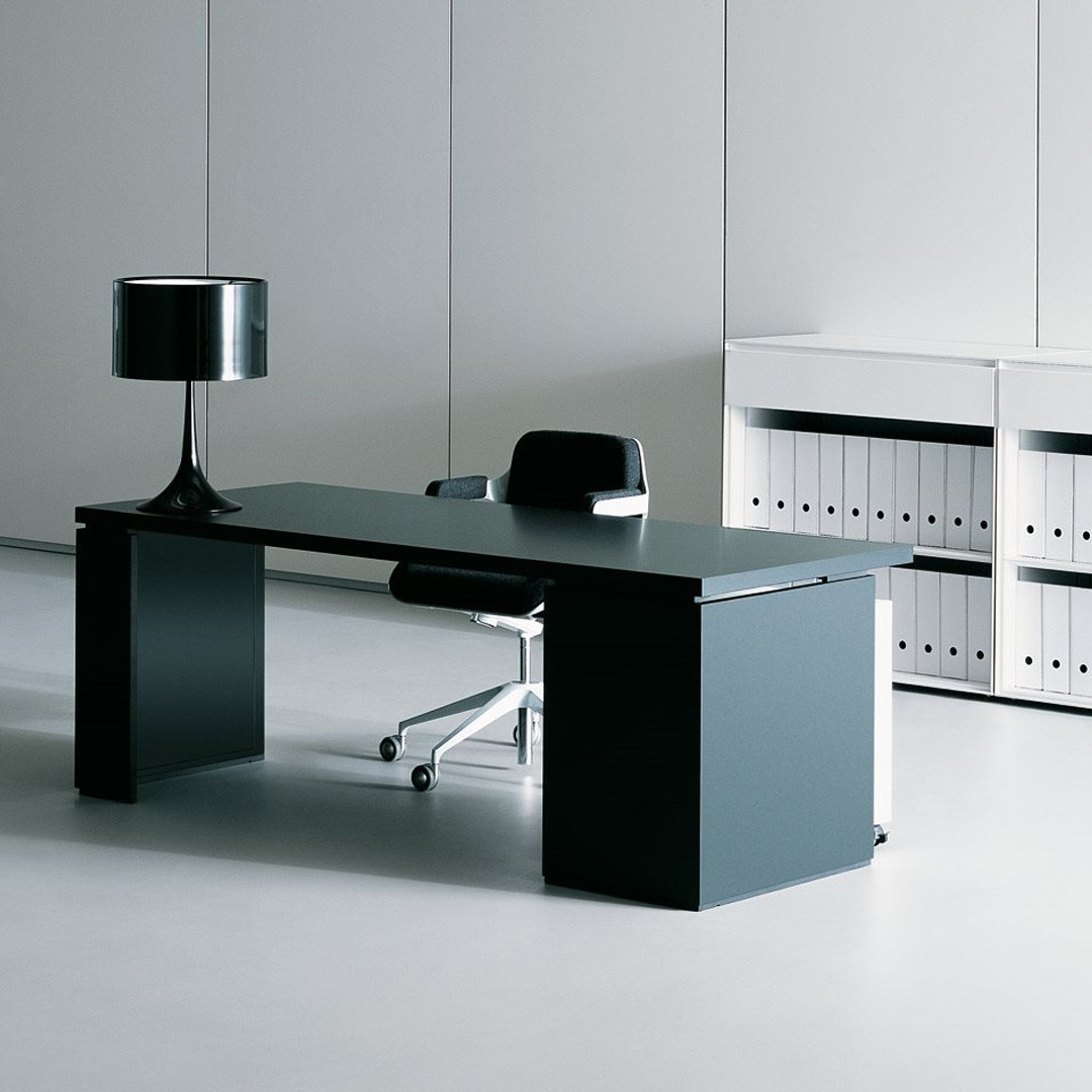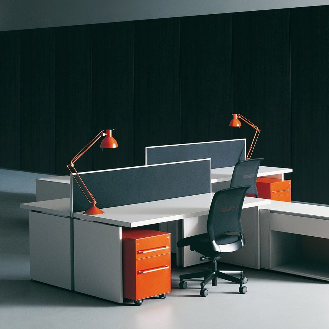 Il sistema, di chiaro successo, è stato ulteriormente aggiornato, proponendo una rilettura di alcuni dettagli e una nuova ampia gamma di colori e materiali. I piani sono ora disponibili in melaminico: bianco, grigio light, grigio piombo, rovere chiaro e rovere grafite; le basi e le cornici dei pannelli divisori sono disponibili con verniciature in colore bianco, grigio light e grigio piombo abbinate a tessuto, melaminico o vetro fumè.