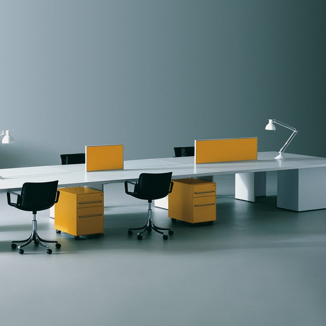 Il sistema Graphis si realizza originariamente con la combinazione di tre elementi base: una “L” portante in lamiera smaltata, una cassettiera e un piano in laminato plastico. Con il passare del tempo al sistema Graphis sono stati aggregati diversi elementi: contenitori, raccordi, tavoli riunione, schermi, tavoli per sistemi audio-video.