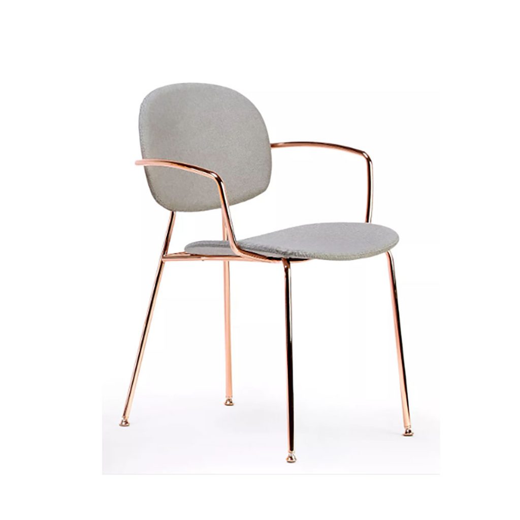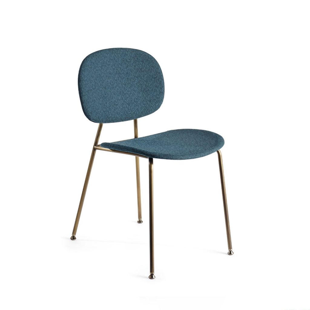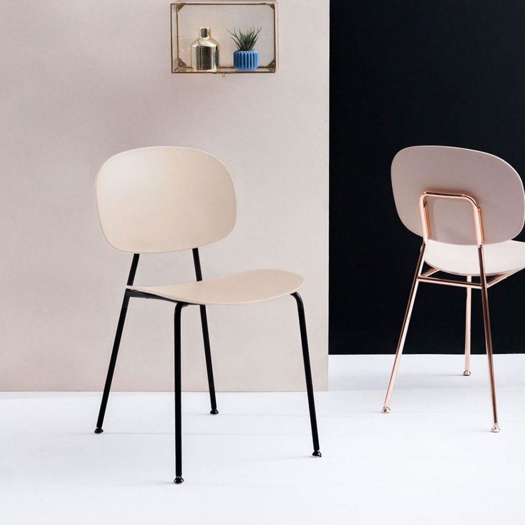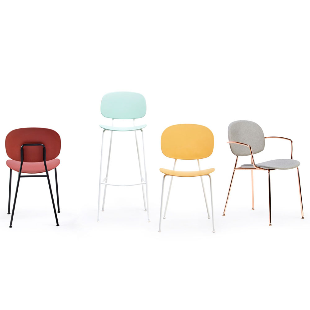 La struttura a 4 gambe è disponibile in metallo verniciato goffrato bianco o nero, in metallo cromato o in metallo cromato nei colori nero o rame.